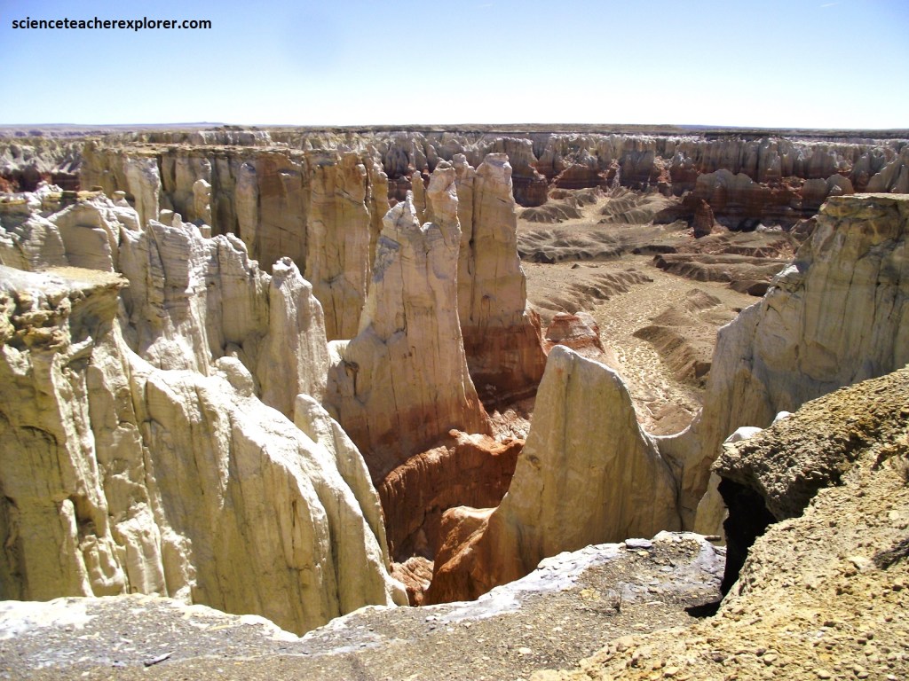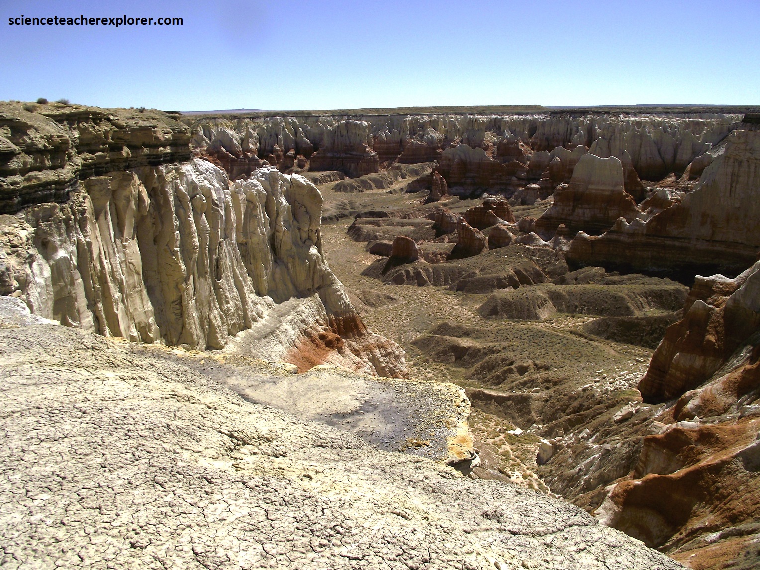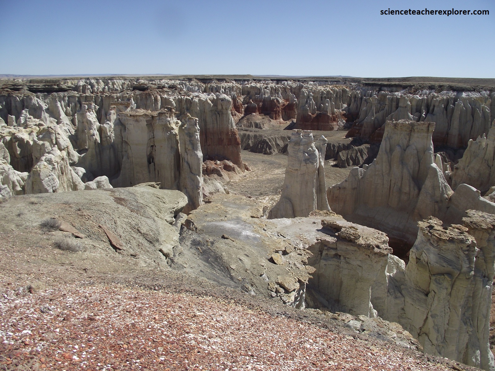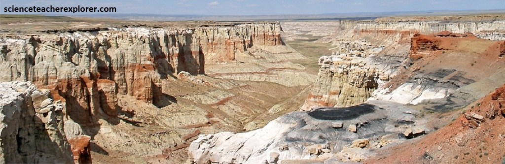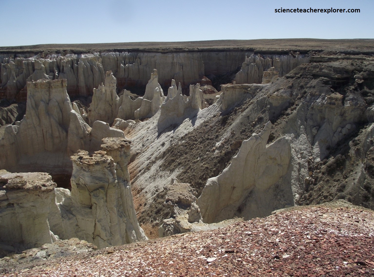Pictured above, Coal Mine Canyon turns into Blue Canyon along the Moenkopi Wash heading east toward Red Lake on US 160. It’s known to the Navajo a “haahonooji”, meaning jagged, which describes the erosion patterns in the canyon. Its top layer is Dakota Sandstone overlying Cowsprings Sandstone. This gray sandstone deposited in streams that cut channels into the underlying Jurassic sandstone, draining into the coal swamps near the coast. A close look at this sandstone reveals that it is chock-full of black carbonized fragments of wood and plant material. The base of this layer represents the Jurassic-Cretaceous boundary and is an unconformity, because beneath this ledge there is a gap in the geologic record where older rocks were removed by erosion before the sandstone was deposited on top.