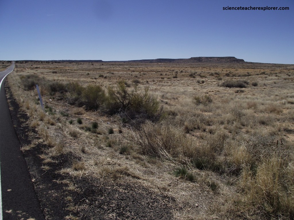 Just south of Bidahochi Butte, I turned right, (west) on US-15 near the Indian Wells Chapter House. In about 6.8 km, the Coliseum Diatreme comes into view on the north side of the road, (pictured below). The stadium-like shape of this deposit is due to two factors: (1) No capping lava flow buried the crater of the diatreme. (2) The Bidahochi Formation, into which the diatreme was drilled, erodes more easily than the tuff and limestone in its interior. Consequently, the rock once forming the outside wall of the diatreme has been eroded away, leaving behind the diatreme’s fill. The walls of the ancient v-shaped vent were just outside the present Coliseum’s wall. The process by which a formerly low area becomes high through differential erosion is called topographical inversion.