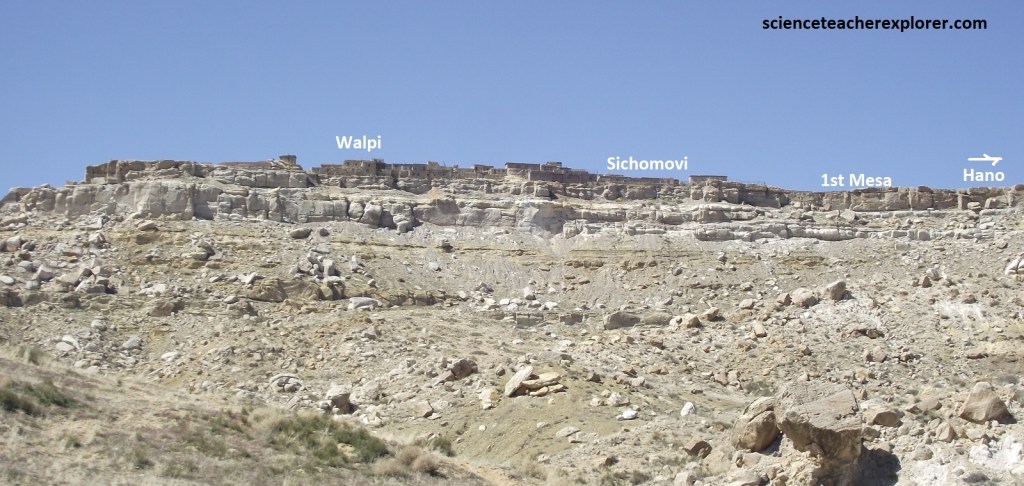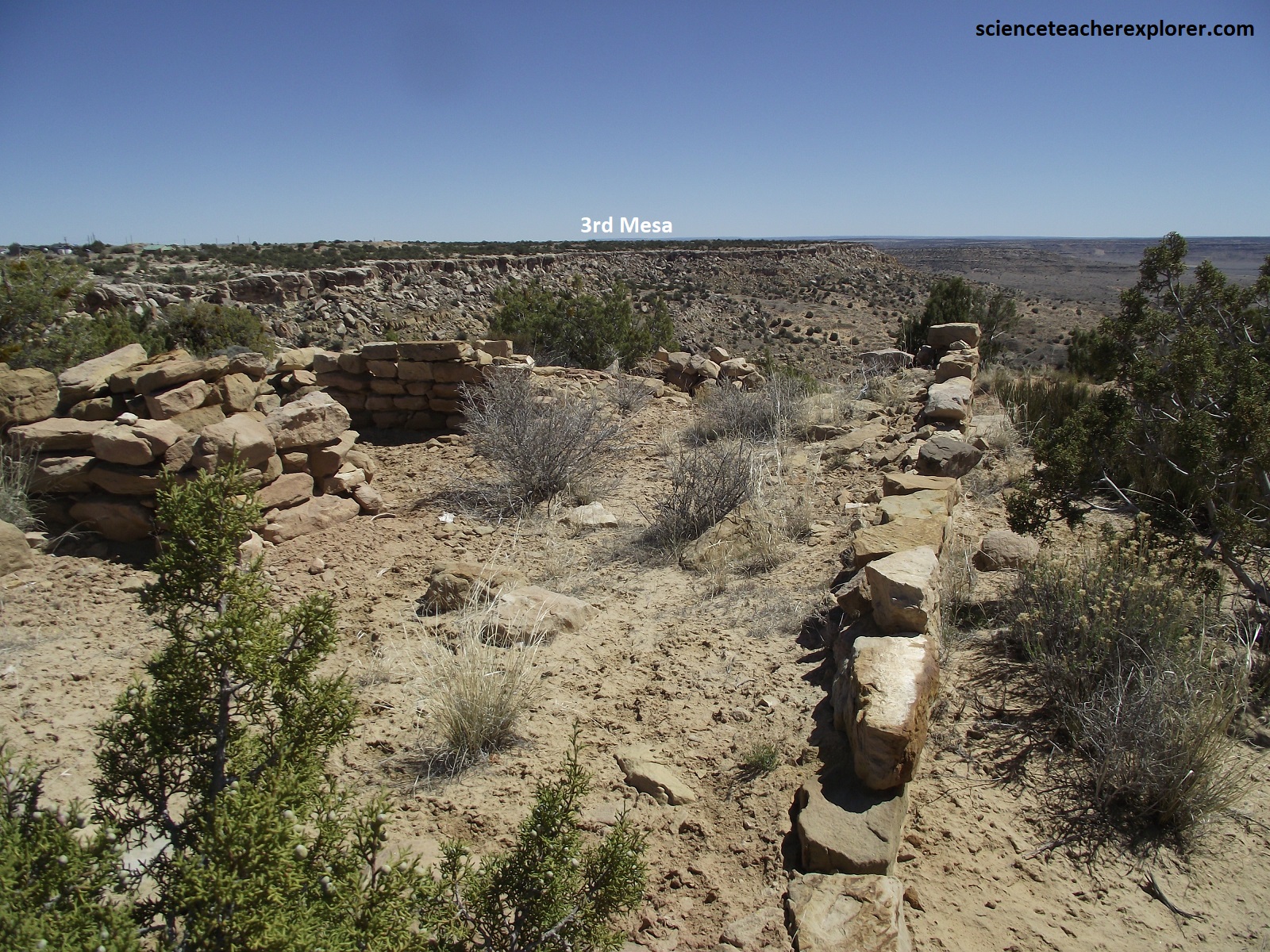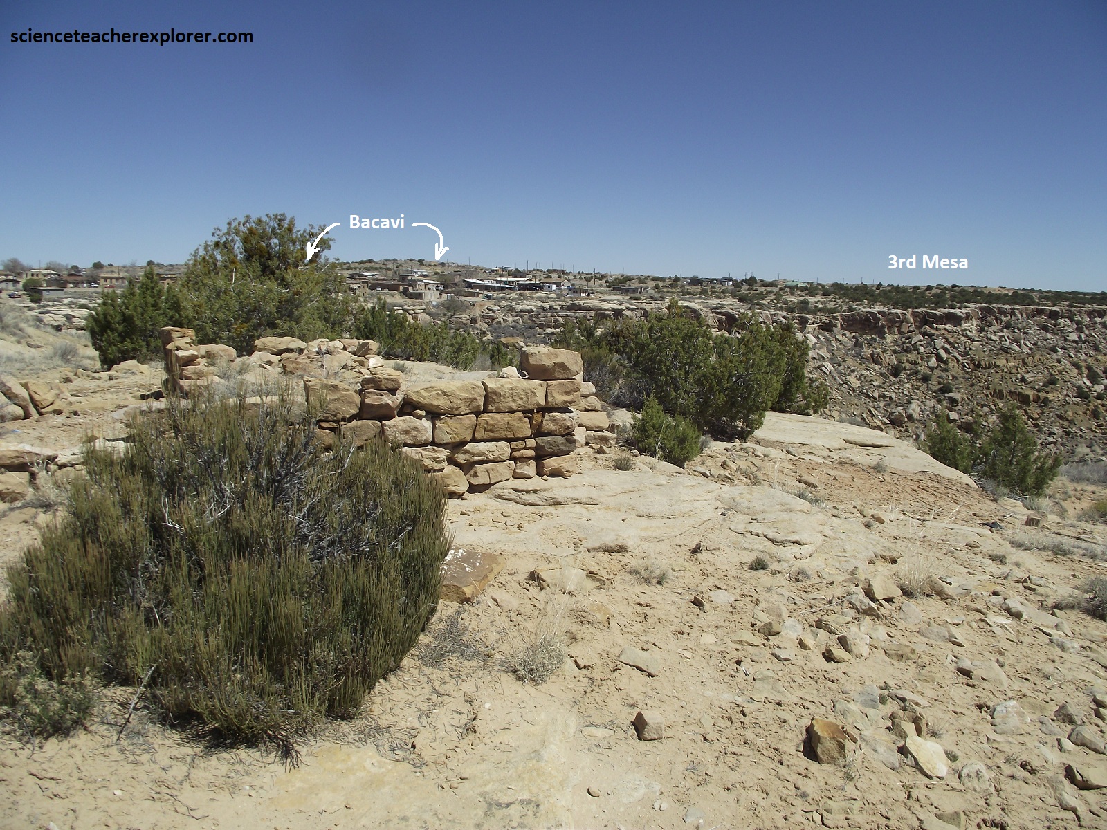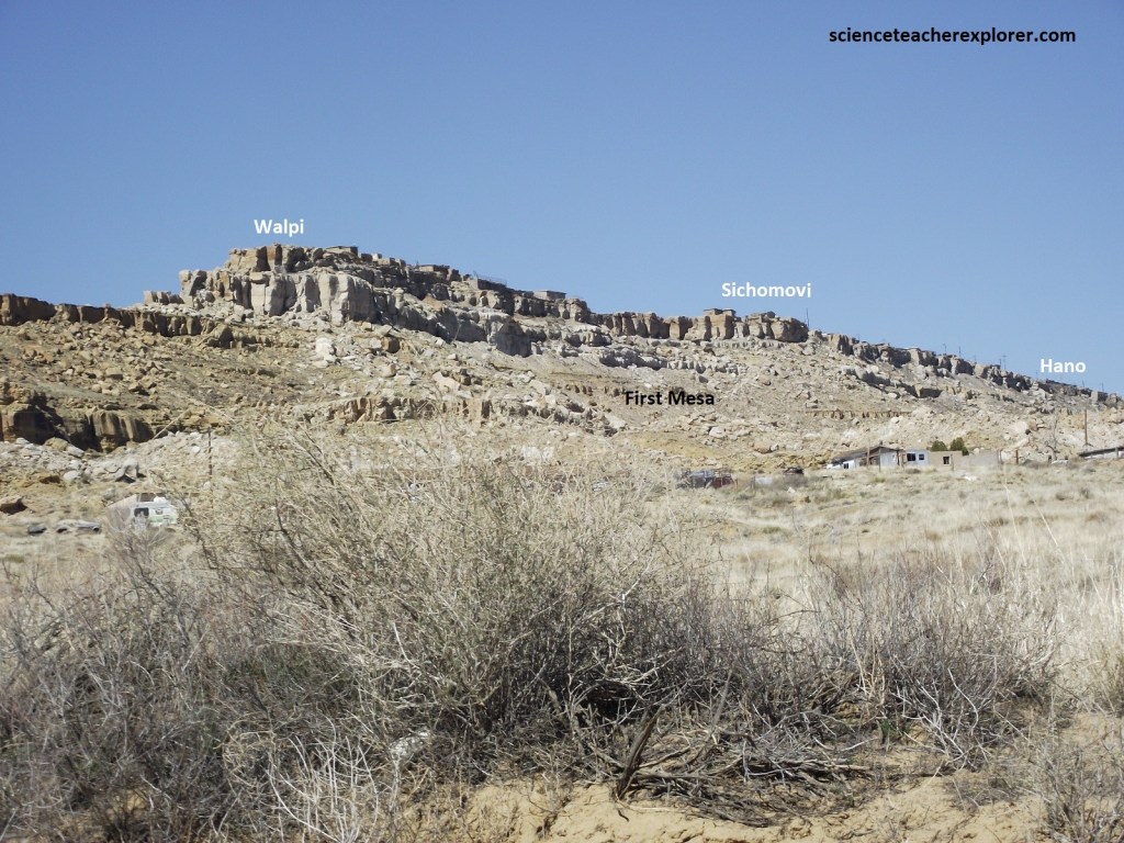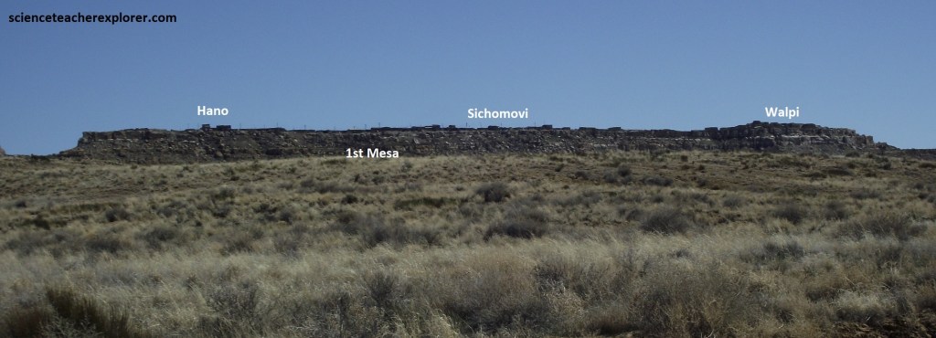 At an elevation of 1,829m, this mesa had two distinct sections. To the east are the villages of Shipaulovi and Mishongnovi, (pictured below). To the west is the village of Shungopavi, (pictured above). In Hopi, “songoopavi” means sand-grass spring-place. It was named for a nearby spring. By tradition, “Old Shungopavi” is the oldest village, established by the Bear Clan, the first clan to arrive on the Hopi mesa after the people’s migrations. The older village is at the base of the mesa, (called 2nd Mesa on the map), where more than 2,000 people lived until fear of retribution of the Spaniards, from the Pueblo Revolt of 1680 caused them to move the village to the mesa top.