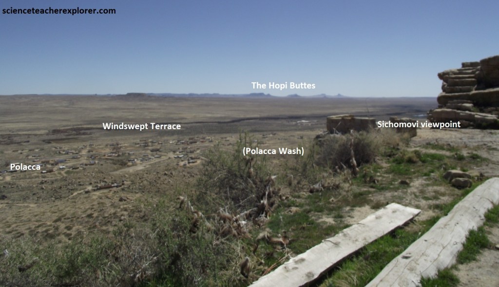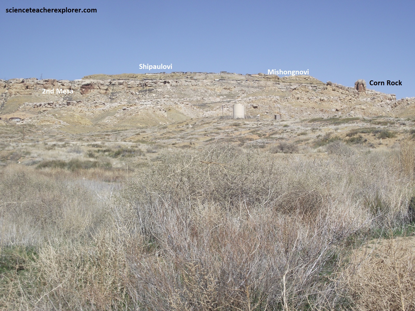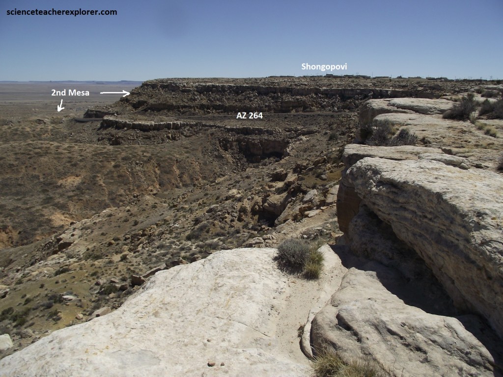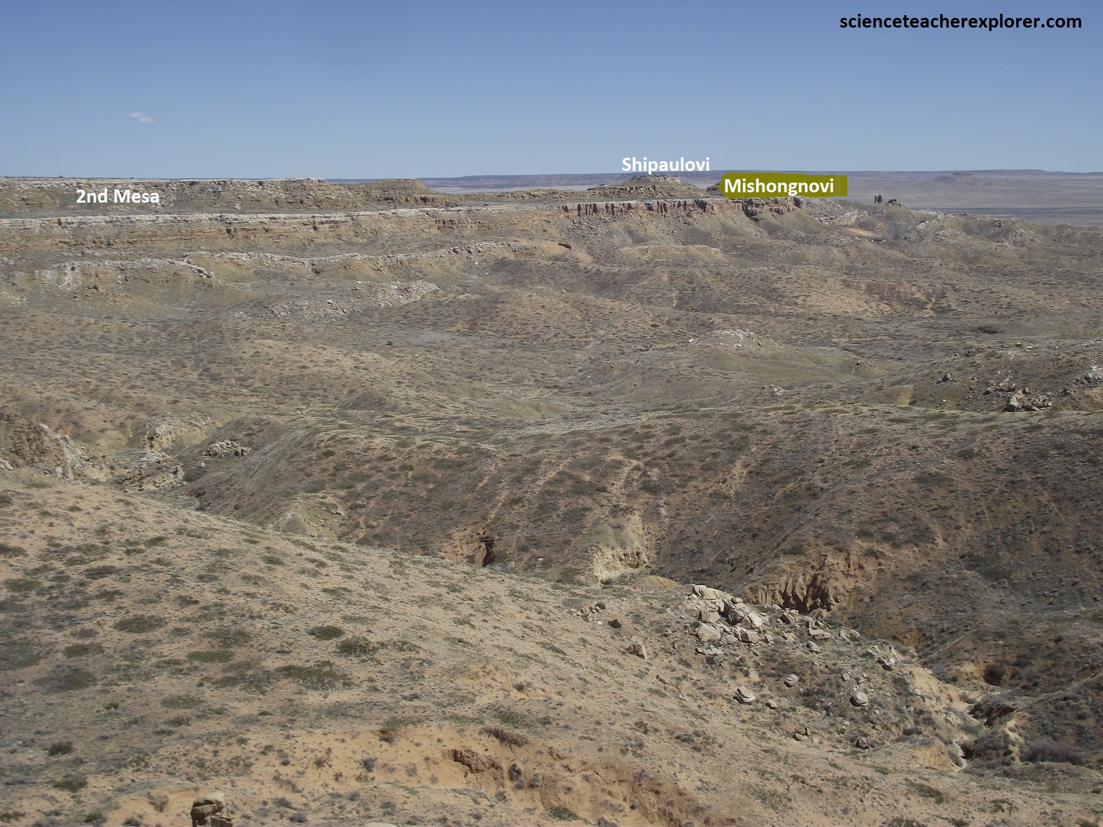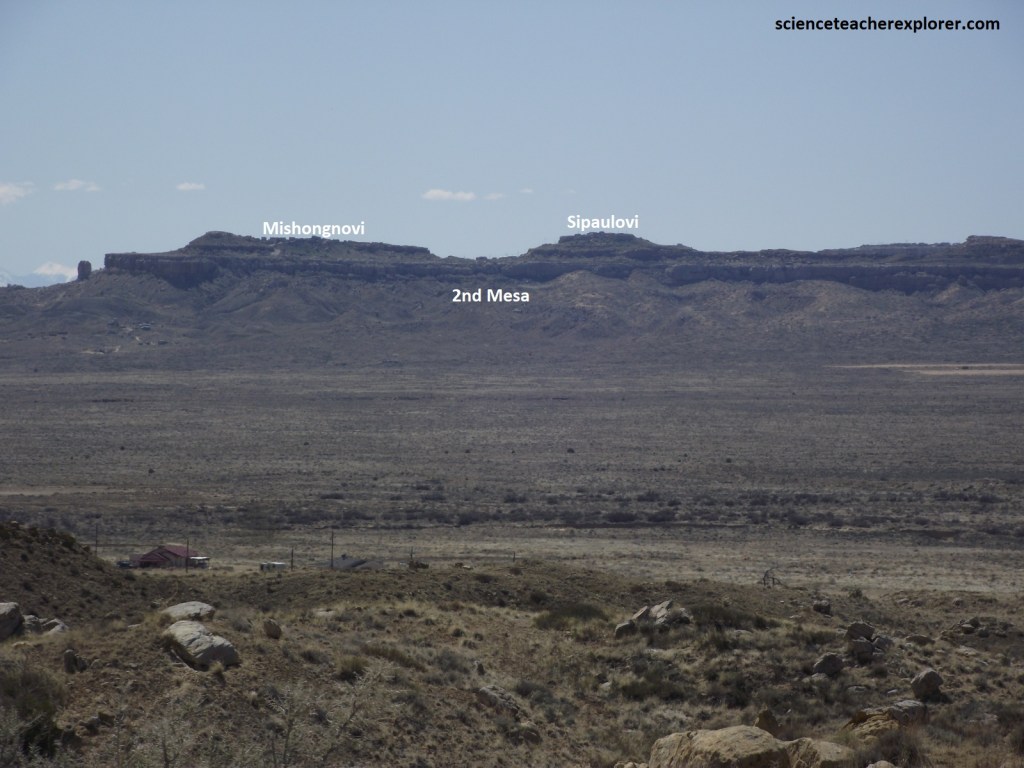 At an elevation of 1,829m, this mesa had two distinct sections. To the east are the villages of Shipaulovi and Mishongnovi, (pictured below). To the west is the village of Shungopavi, (pictured above). In Hopi, “songoopavi” means sand-grass spring-place. It was named for a nearby spring. By tradition, “Old Shungopavi” is the oldest village, established by the Bear Clan, the first clan to arrive on the Hopi mesa after the people’s migrations. The older village is at the base of the mesa, (called 2nd Mesa on the map), where more than 2,000 people lived until fear of retribution of the Spaniards, from the Pueblo Revolt of 1680 caused them to move the village to the mesa top.