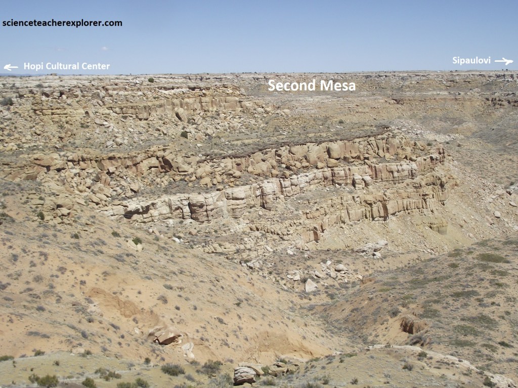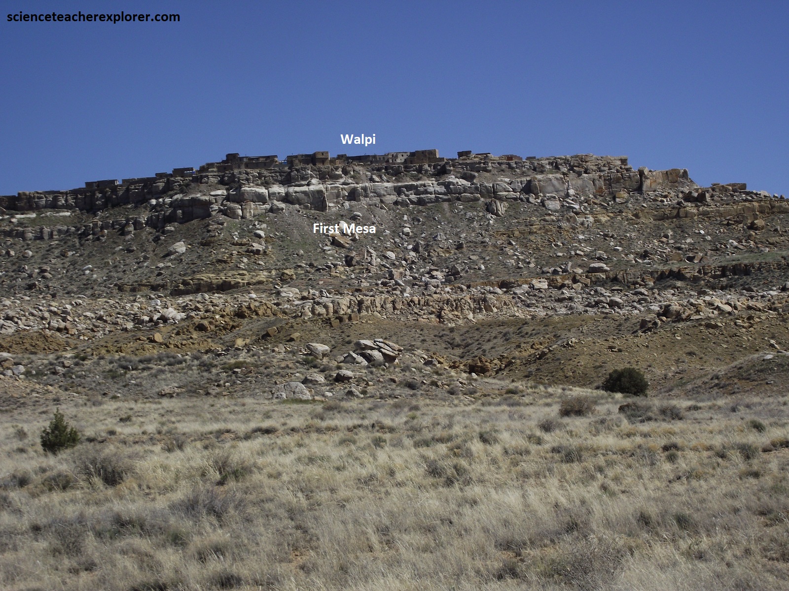First Mesa, which has the steepest sides and is the narrowest of the three, rises to a height of 200m. It is the easternmost populated mesa jutting out from the Black Mesa core in the Hopi Nation. It contains three villages, Hano, Schomovi, & Walpi. Antelope Mesa is part of the Black Mesa further to the east, but is not occupied. The Wepo and Polacca washes, which traditionally supplied water used in Hopi agriculture, borders either side of the First Mesa.