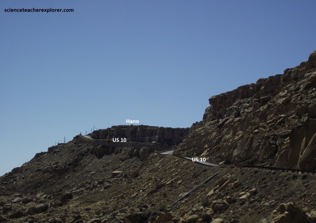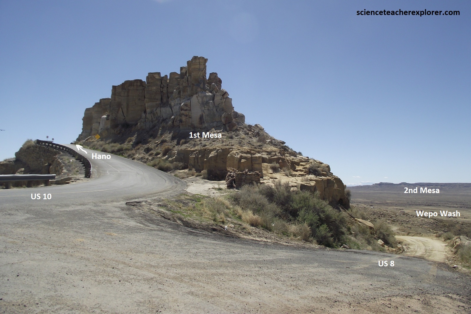 The route up First Mesa makes no attempt to scale its boulder-stewn west wall, but skirts the rocky rubble at the base to the town of Polacca, where a pave side road, (US-10), hugs the eastern cliff as it makes a daring ascent.