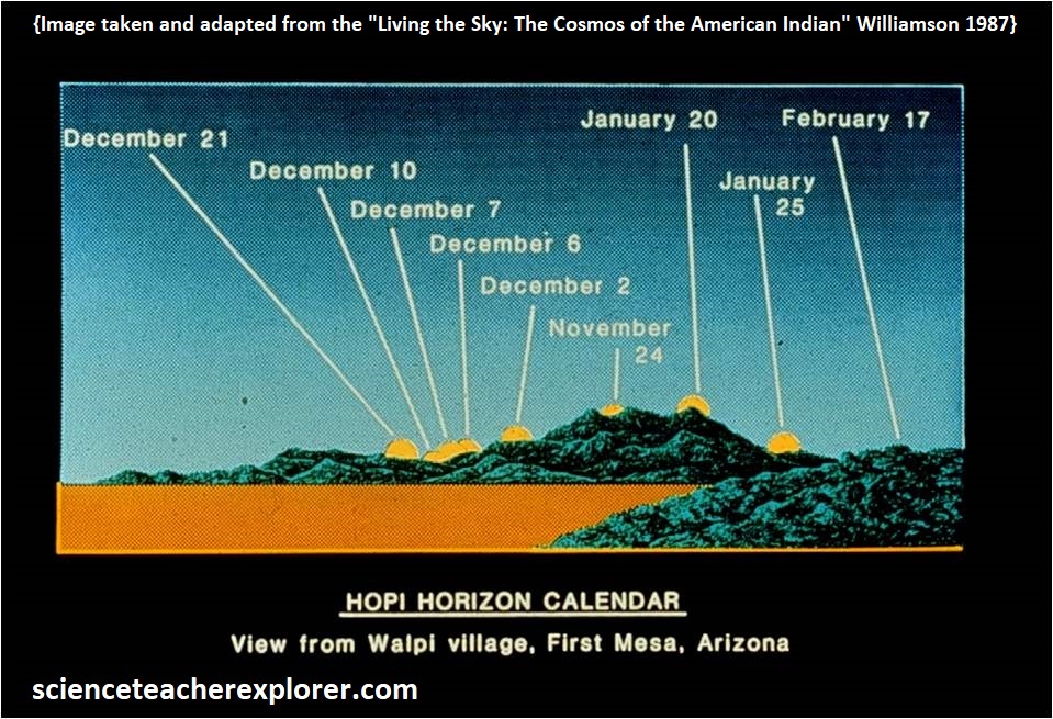 The Hopis have strictly adhered to a sophisticated ceremonial calendar. Specific holy men in each village continue to determine the timing of individual ceremonies by the position of the sun, similar to the public domain image below.