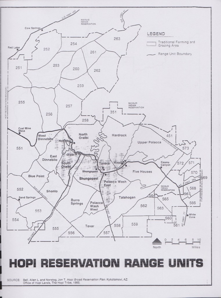 As my drive headed southeastward away from Tuba City on Rte. AZ-264, it soon swept into the village of Moenkopi. Though the village was surrounded by the Navajo Indian Reservation, it was a Hopi community, the first of several to be seen along the way. The settlement’s name means “place of running water,” and year-round springs do indeed keep the surrounding fields green and the local fruit-trees productive. [When Mormon explorer/missionary Jacob Hamblin met the Hopis in 1858, there was no permanent village here. Hopis gradually built the village beginning around 1870. Hopi farmers from the village of Oraibi, more than 48 km away by trail, managed large cotton farms in the very fertile Moenkopi Wash, running several times a week from home to their fields]. Present-day Moenkopi actually consists of two villages. Upper Moenkopi is the more modern, established in the 1930s around the Bureau of Indian Affairs Day School. Lower Moenkopi was more traditional in its lifestyle, maintaining close religious ties to Old Oraibi.