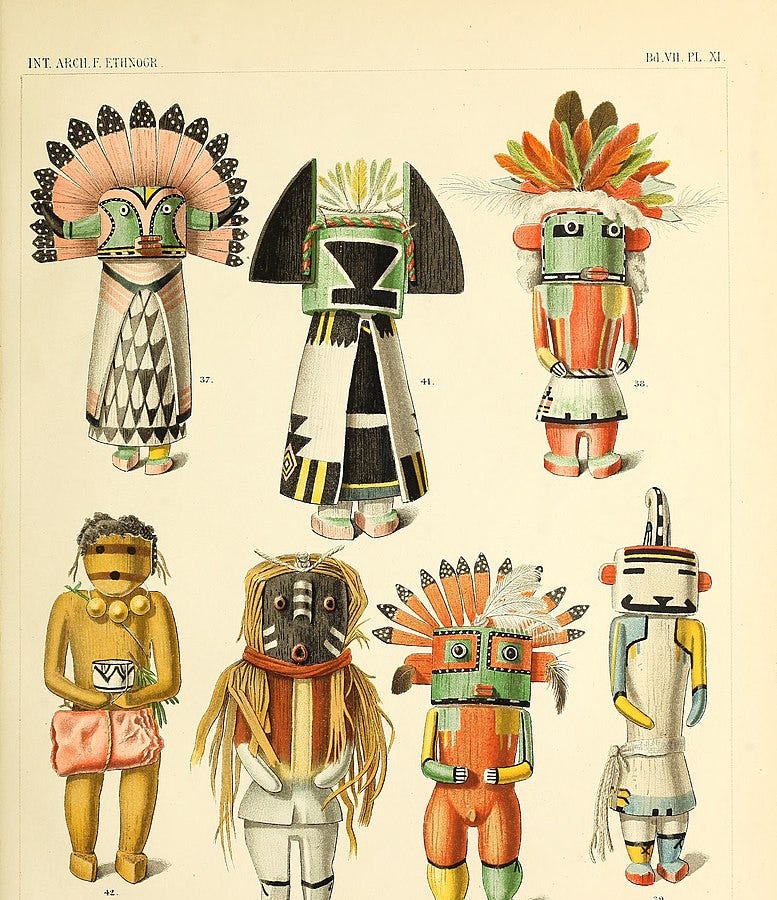 “Katsinas”, or kachinas, as they are popularly called, are the very important spirit beings in Hopi cosmology who assure rain for the Hopis and all people on earth. The Katsinas visit the Hopis and bring gifts. At the end of a dance, prayer feathers are given to the katsinas so that the prayers for rain and good things will be carried in all directions. These dances are the way of communicating the Hopis’ needs to the Supreme Creator. Katsina dances are not always open to non-Hopis, (including me). {The images below are of public domain and generously shared by Hopi artists, i.e. Ray Naha on the right}