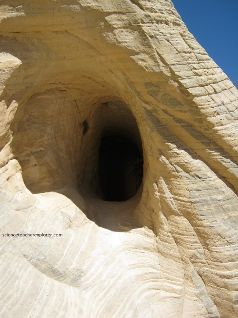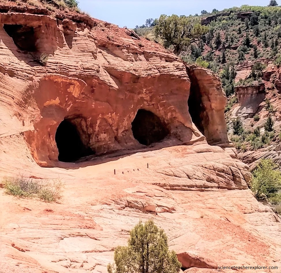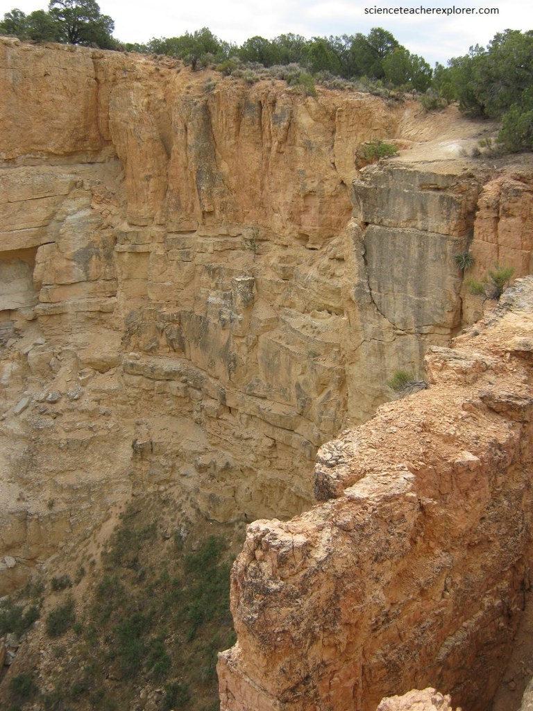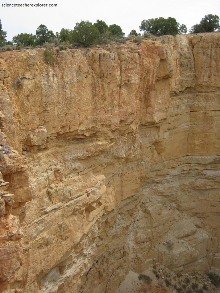 The Triassic Timpoweap-Formation and the Kaibab-Formation underlies the sinkholes and is known for such gypsum “karst” features elsewhere in the area. Alternatively, or in conjunction with gypsum dissolution, part of an underlying limestone bed might have been dissolved and carried away in ground water. Both of these formations are of a yellow-grey color.