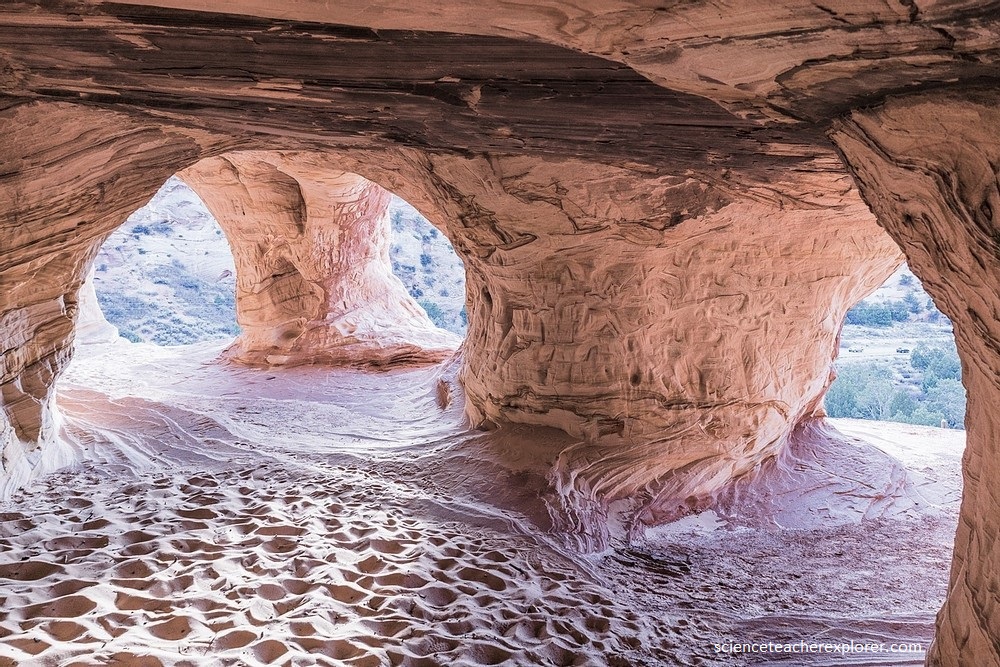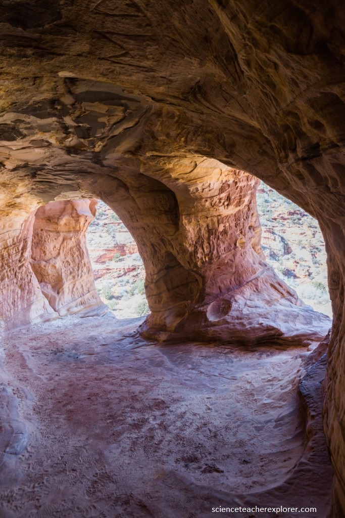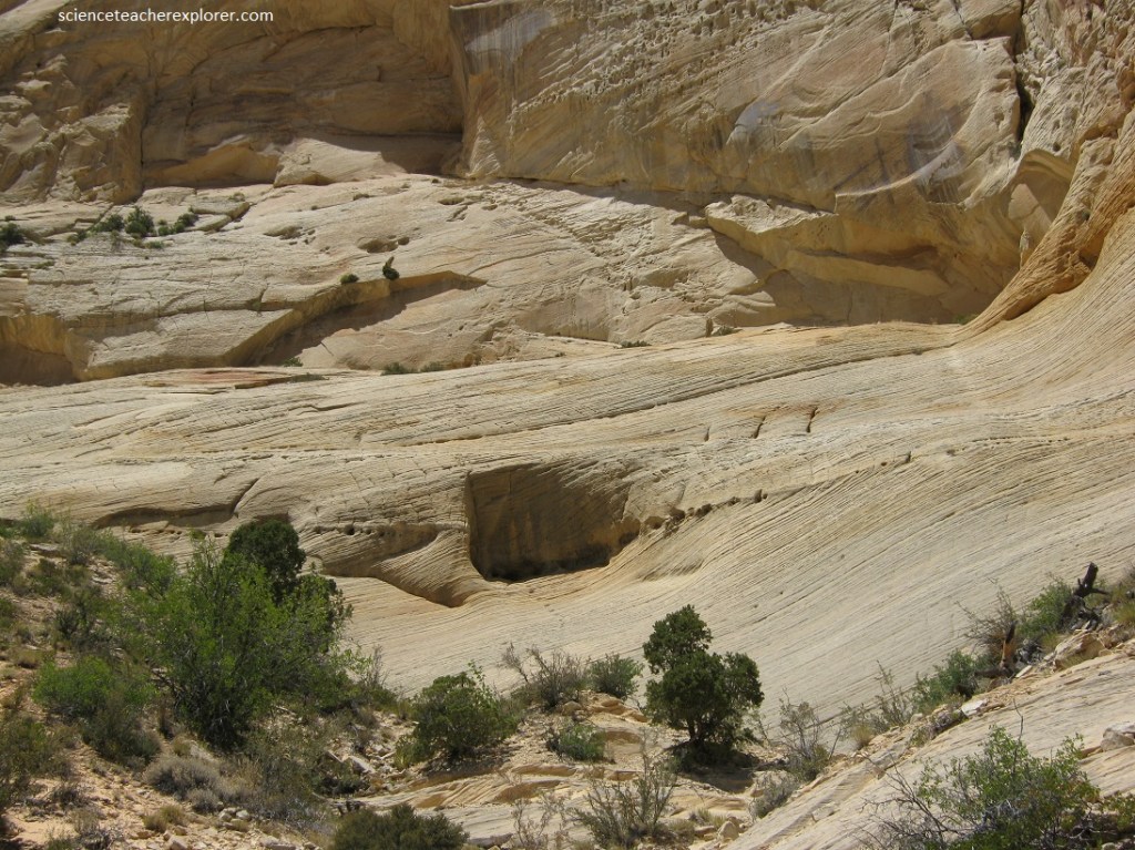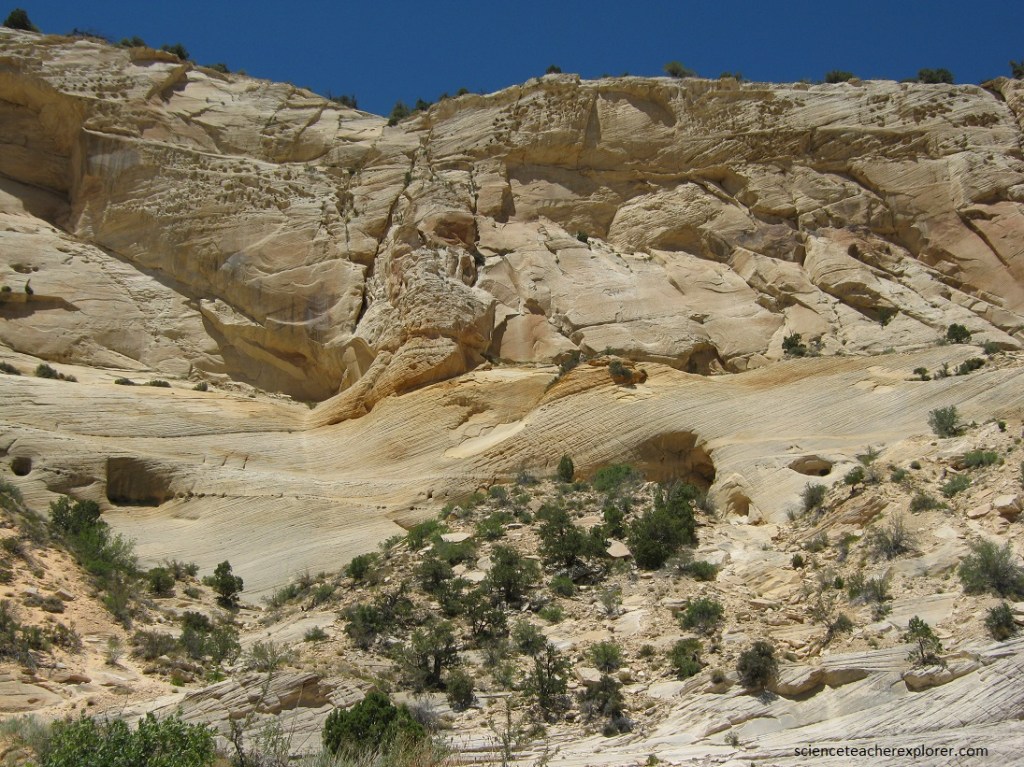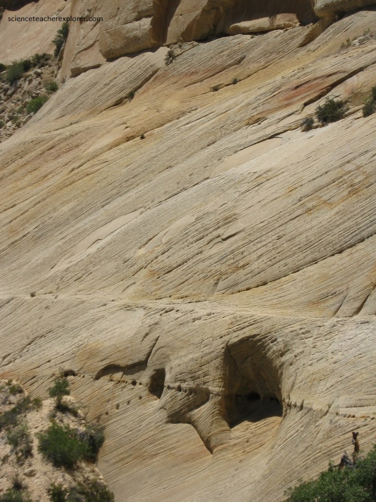 The Triassic Timpoweap-Formation and the Kaibab-Formation underlies the sinkholes and is known for such gypsum “karst” features elsewhere in the area. Alternatively, or in conjunction with gypsum dissolution, part of an underlying limestone bed might have been dissolved and carried away in ground water. Both of these formations are of a yellow-grey color.