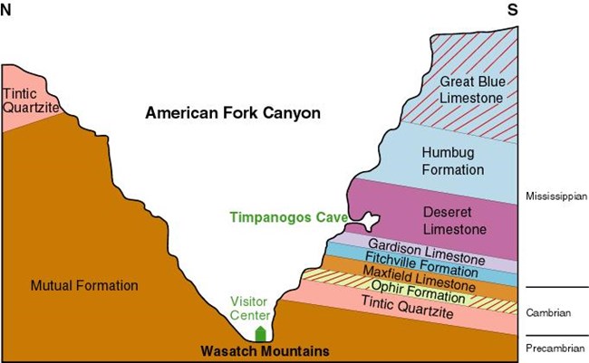 The Timpanogos Caves typify limestone caverns, having developed where groundwater, slightly acidified by absorption of carbon dioxide from air and soil, dissolved passages through cracked and faulted limestone. The massive layer in which the caves have formed is steeply tilted and is part of the southern flank of a large fault-edged anticline, cored with granite, that crosses the north-south trend of the Wasatch Range.