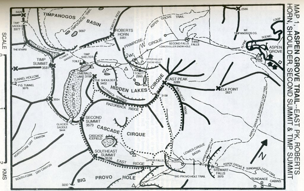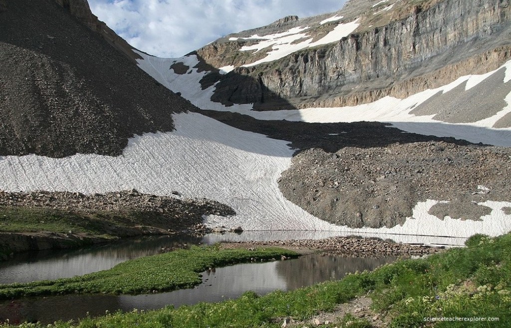 Pictured above, Emerald lake is northeast of the summit of Mount Timpanogos, at the base of the almost vertical northeast face of the mountain, with an elevation of 3,169 m. The now mostly vanished and completely buried Timpanogos Glacier, left behind a terminal moraine which now impounds the lake. The runoff from the snow field, (seen above) feeds the lake and colors it blue. Emerald Lake was accessible to me in 1986 by hiking from Orem, up through “Dry Canyon to the summit at the saddle above “Emerald Lake, and then down the Mount Timpanogos Trail (also known as the Aspen Grove Trail) to Aspen Grove.
