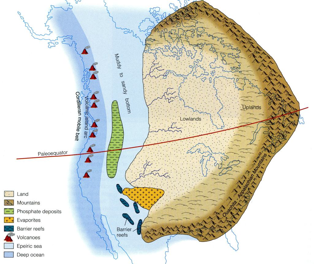 Patterns of Precambrian deposition seem to have lasted into Paleozoic time. The equator then lay along the line of the present Wasatch Range, and for hundreds of millions of years the same line acted as a sort of hinge, with thick sedimentary strata characteristic of a deep-water basin deposited north of the equator (now) west) and thin sedimentary layers accumulating in shallow seas to the south (now east).