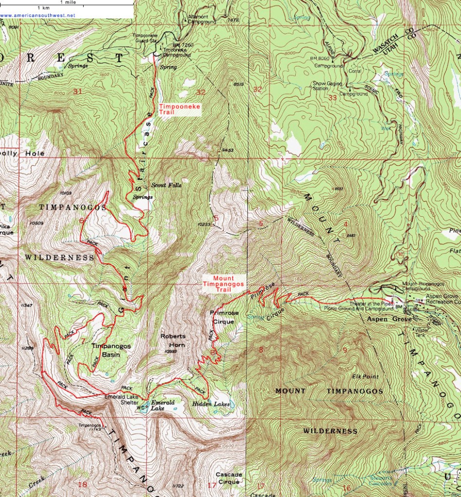 Mount Timpanogos is one of Utah’s most popular hiking/climbing destinations and is climbed year round. In spring, undercutting of deeply drifted snow by streams creates a hazard that has proven fatal on several occasions. Imaged above, there are two main trails to the top: the first starts at Aspen Grove with a trailhead elevation of 2,106 m, and the second starts at the Timpooneke campground in American Fork Canyon.