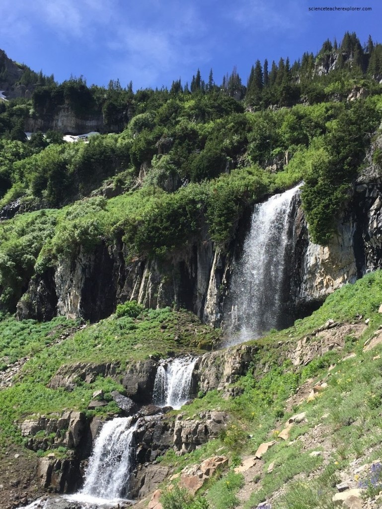 My 1984 ascent/descent took me through a montane forest, subalpine and alpine zones. This extreme hike was marked by waterfalls (pictured below), conifers, rocky slopes and ridges, snow-field, and a small Emerald Lake.