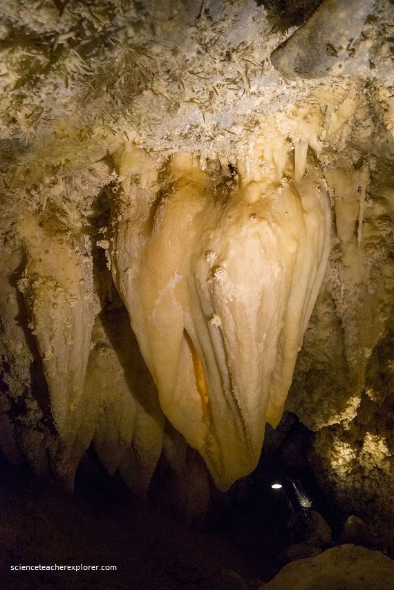 Pictured below, the helictites makes the Timpanogos Cave famous. Their twisted curlicues seem at odds with the vertical patterns of stalactites, stalagmites and draperies. They are thought to develop when thin layers of fine crystalline calcite coat cave surfaces in such a way as to seal the rock, so that water seeping into rock pore spaces cannot escape into the cave. Behind this thin dam, water accumulates and water pressure increases. Then, in places, the pressure pushes out tiny fragments of the calcite coating. Once the dam is breached, successive layers of newly formed crystals are pushed out at the same spots. Because the crystals may be wedge shaped, the growing helictites curve and curl, responding more to water pressure and crystal shape than to gravity.