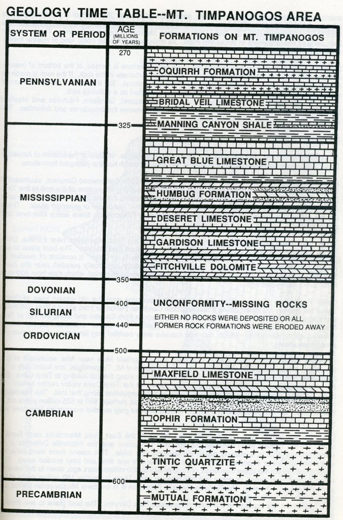 Pictured below, sedimentary rocks low in the walls of American Fork Canyon, (the Tintic Quartzite, Ophir Shale, and Maxfield Limestone), are part of a great blanket that stretched from Arizona into Canada in late Precambrian time, about a billion years ago.