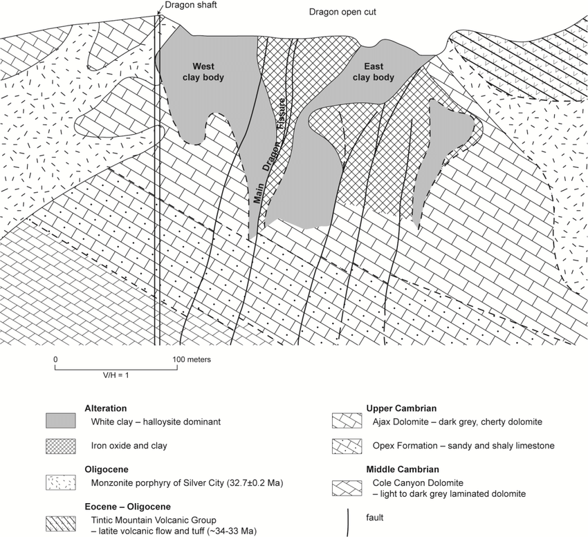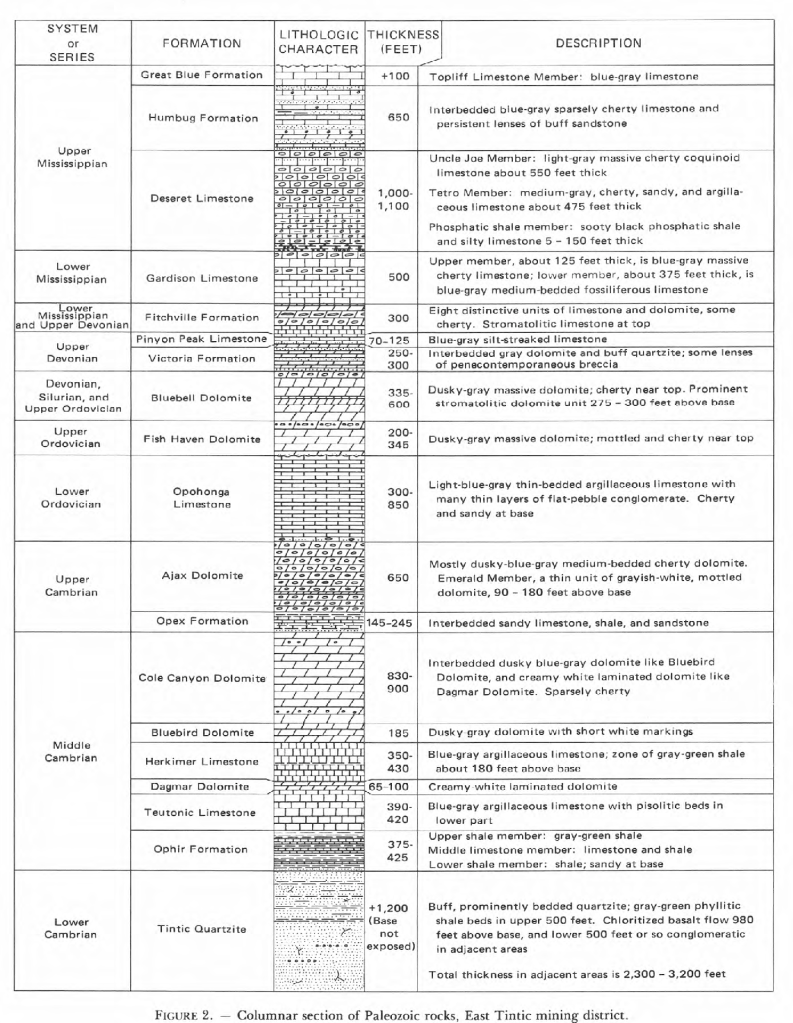 The mountains are underlain by Precambrian and Paleozoic strata that underwent complex folding and faulting during the Sevier orogeny of Cretaceous age. In Oligocene and Miocene time the deformed strata were intruded by intrusive volcanic stocks and volcanic rocks buried the youthful land forms. The Paleozoic rocks which range in age from Cambrian (Tintic Quartzite) to Mississippian unconformably overlie the Precambrian. Overlying the Tintic Quartzite is the Ophir Formation of limey shales and limestones of the Middle Cambrian to Upper Mississippian. The Ophir is an important ore host in the East Tintic district. Above the Ophir Formation, sandstones and shale are distinctly subordinate to carbonate rocks. All of the units above the Ophir, host at least small replacement deposits, but most of the mineral production came from five units as follows: $35 million from the Tintic Quartzite ;$200 million from the Ophir Fm.; $135 million from the Blue Bell Dolomite; $60 million from the Ajax Dolomite; & $47 million from the Deseret Limestone (Mississippian)