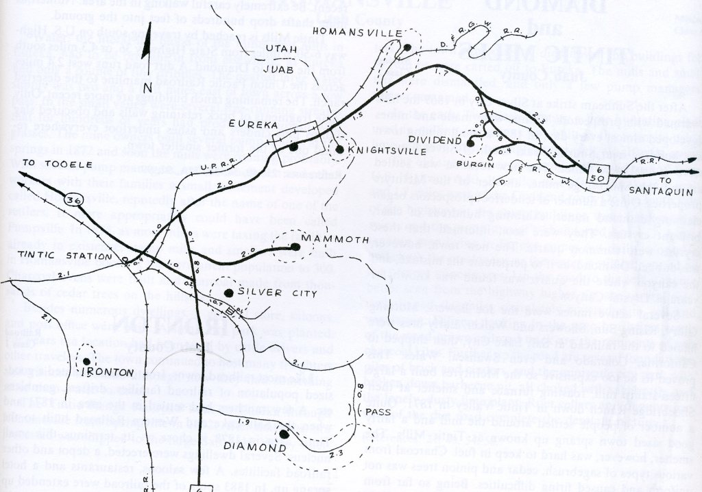 Pictured above, Silver City was the original mining camp in the Tintic Mining District. The Sunbeam Mine, the first mine in the Tintic district, was discovered by Mormon prospectors in 1869. By 1870 other deposits had been located and once word got out a rush was on to the new mines of Utah. Silver City, located at the mouth of Dragon Canyon, was the first town established. Silver City was the premier camp in the district during the early 1870’s. The district’s telegraph, express, and recorder’s offices were all located in the town.