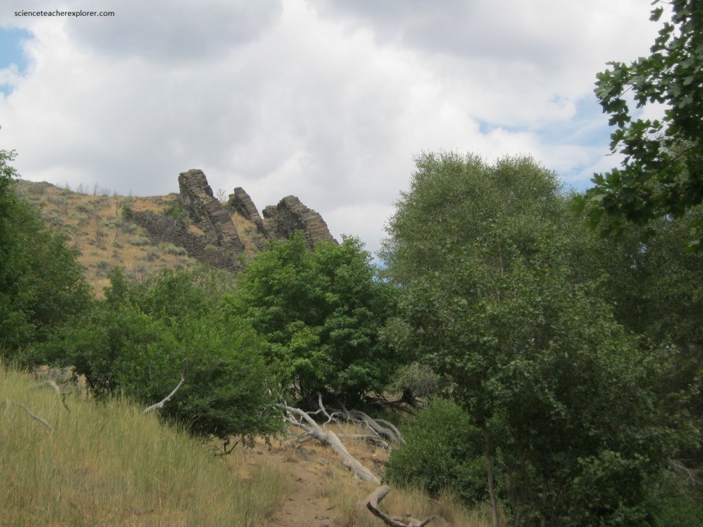 Pictured above, the “Woodpile” is a classic example of columnar jointing where the rock fractures in prismatic patterns, producing parallel columns. These columns formed when cooling magma within the dike contracts, forming cracks similar to those on the surface of a cooling cake. Once a crack forms, it continues to grow from subsurface cooling, thereby forming longer and longer columns.