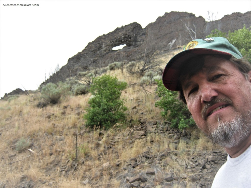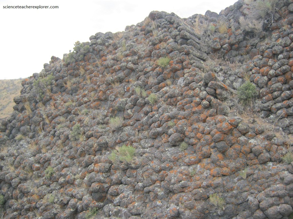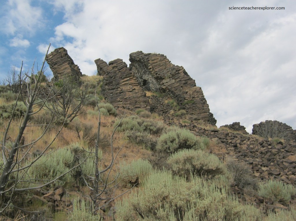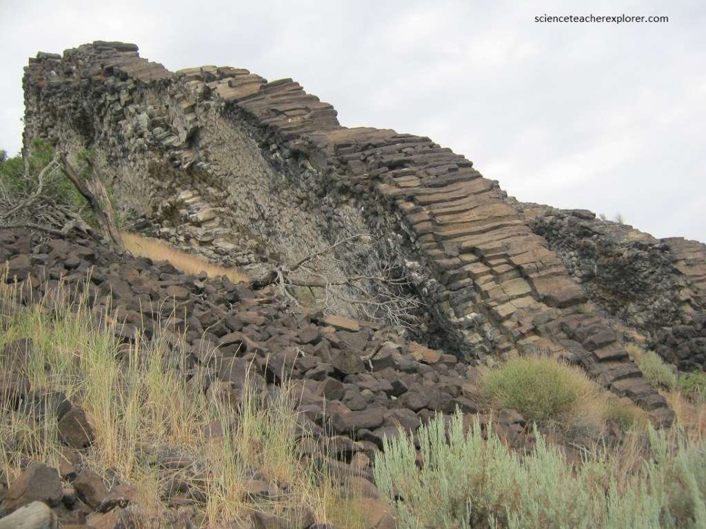 Usually columnar jointing is associated with lava flows with the joints oriented vertically. However, the horizontal orientation at Paul Bunyan’s Woodpile, appears to be the result of subsurface cooling horizontally from the sides inward to the middle of the dikes. Then erosion took away the overburden, leaving the dikes behind.