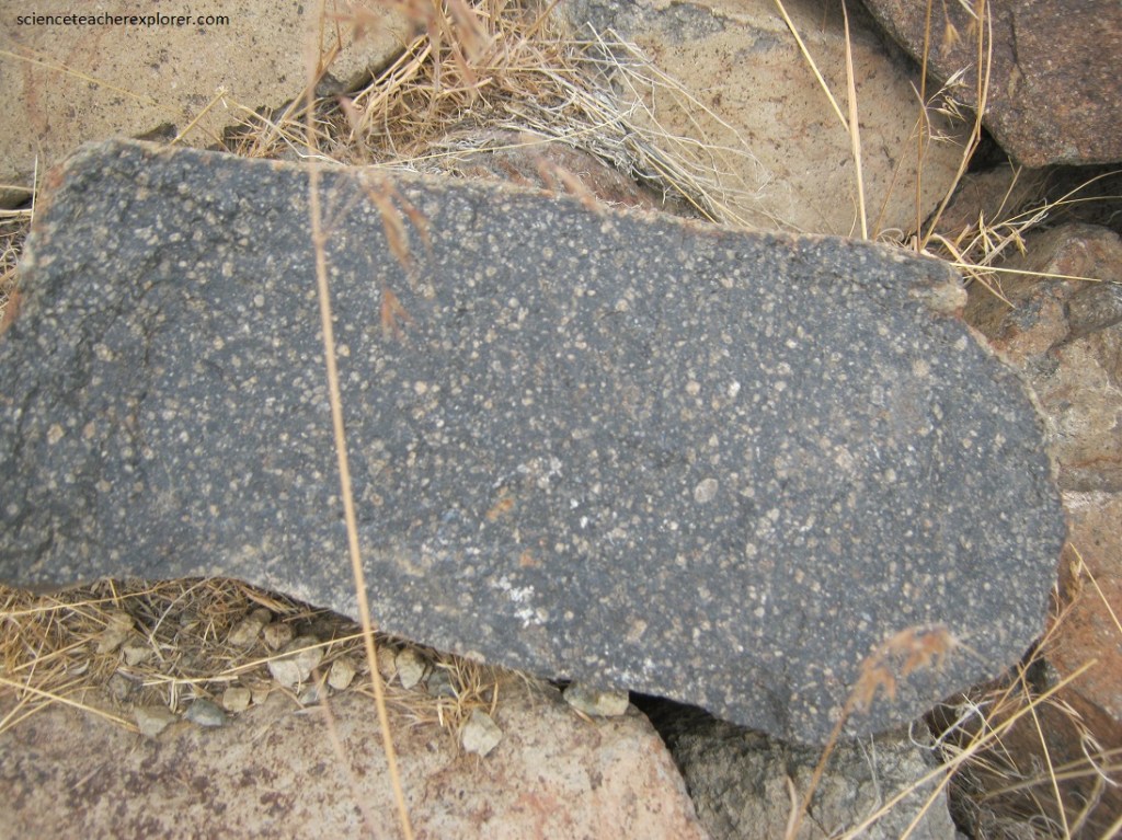 Pictured above, a Vitrophyre is a volcanic rock with a porphyritic texture in which larger crystals (phenocrysts) are embedded in a glassy groundmass. A Vitrophyre form when there is a sharp temperature gradient, resulting in a rapid cooling or quenching from water and forming a glassy basal vitrophyre. So the dikes was probably subjected to water during cooling.