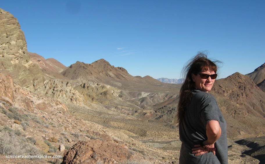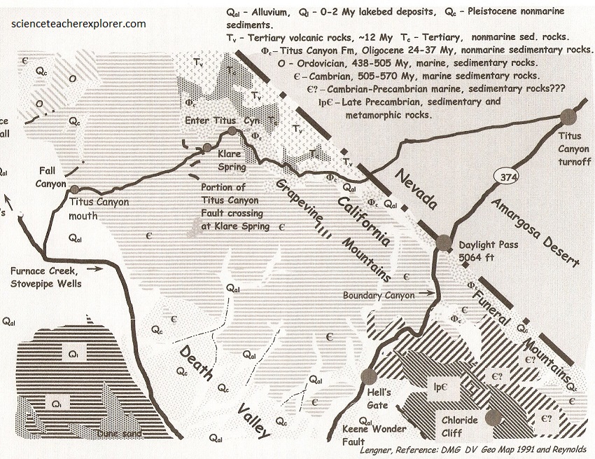 This one-way road took us across the Grapevine Mountains, beginning in the upper reaches of the Amargosa Valley near Rhyolite, and ending in Death Valley. Both the geology and scenery were spectacular. The trip began in Upper Tertiary volcanic rock, descends through the Oligocene Titus Canyon formation, and continues down through Paleozoic strata. The Paleozoic strata are deformed into a mountain-scale overturned folds, so the lower reaches of the canyon within overturned rock.