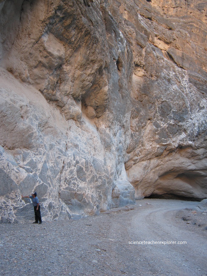Pictured below, I’m standing next to a mosaic-wall of broken limestone blocks re-cemented with white calcite. Many of the blocks do not touch each other, but appear to be floating in the white calcite. It is therefore likely that the fracturing and calcite mineralization occurred in many stages, each of which gradually separated individual blocks. The breccia is probably not a product of faulting, however, because there are no obvious faults here. Instead, it may be related to progressive fracturing and calcite mineralization during late stages of folding.