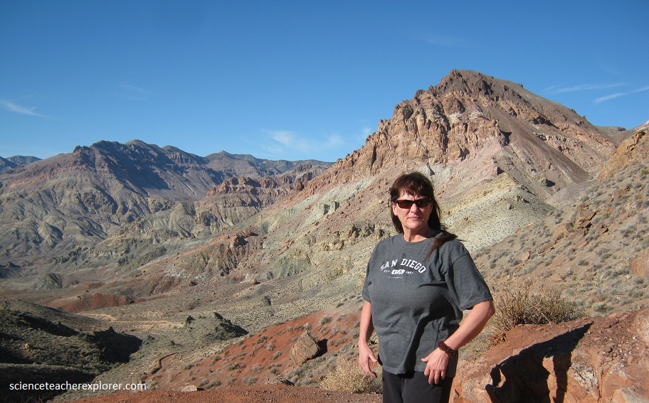 In the above photo, the nearby light and dark multicolored peaks and hills are underlain by Tertiary volcanic rocks, whereas the craggy peaks behind them consist of Paleozoic sedimentary rocks. Of these, the red-colored peaks are part of the Cambrian Zabriskie Quartzite. The volcanic rocks consist predominantly of felsic lava flows and welded tuffs that are about 22-20 million years old.