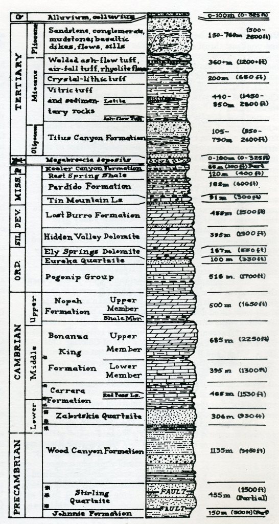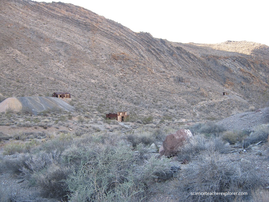 Pictured above, Leadfield marks the site of a large, but low grade body of lead ore that was promoted on the Los Angeles stock exchange in 1927 as a high grade body, accompanied by exorbitant and sometimes fraudulent claims of it’s value. No lead was actually produced from the mine, but many investors lost a great deal of money. Behind the buildings, the Bonanza King Formation dips steeply eastward. It is faulted against the less steeply dipping Titus Canyon Formation.
