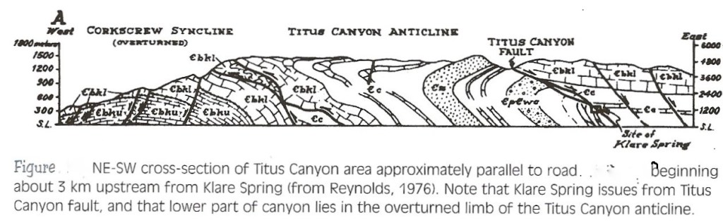 A few kilometers west of Leadfield is Klare Spring. Klare Spring issues from the Titus Canyon fault, a low-angle normal fault that dominates much of the structural geology of Titus Canyon. In general, the fault places the Cambrian Bonanza King formation above the fault against older rocks below the fault. After crossing the Titus Canyon Anticline, the road enters an antiformal syncline and synformal anticline. The rocks here are in the overturned limb of the much larger Titus Canyon Anticline. These folds are upside down. Therefore, the antiform is actually a syncline and the synform is an anticline, imaged above.
