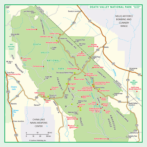 Titus Canyon Road is a one-way dirt road. The road starts outside the National Park on Daylight Pass Road near Beatty, Nevada. Running west into the park, the road climbs over two high points in the Grapevine Mountains (including Red Pass at 5,240 ft elevation), drops past the ghost town of Leadfield, and finally descends through the narrow and sinuous canyon for which the road is famous. Finally, the road descends onto the alluvial fan to Scotty’s Castle Road that leads to Furnace Creek in Death Valley National Park.