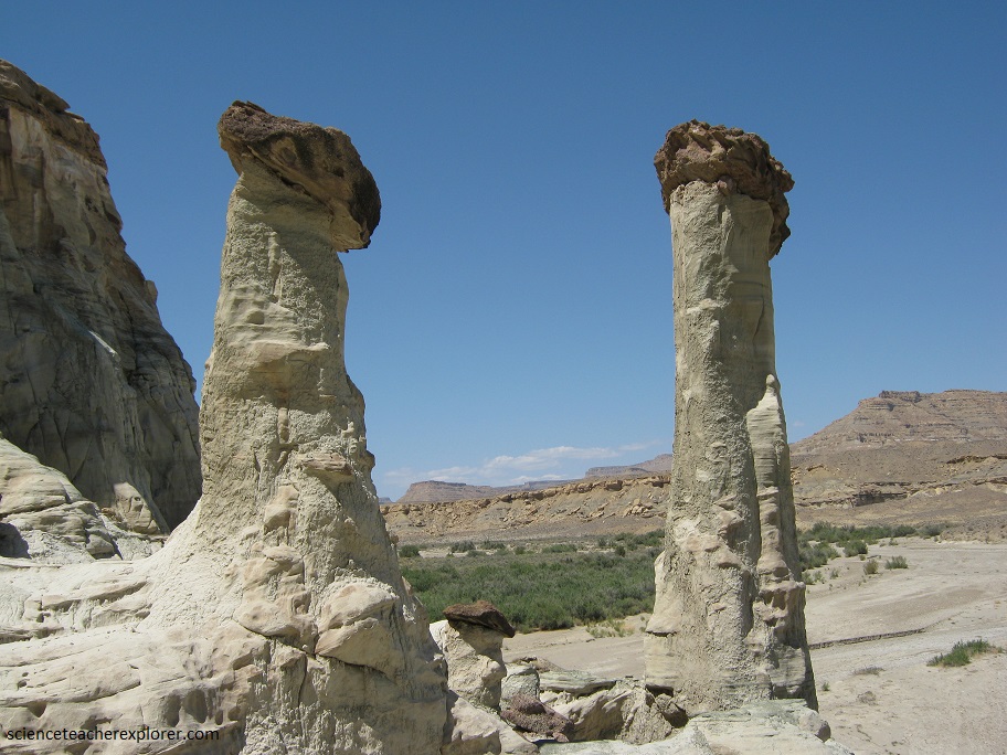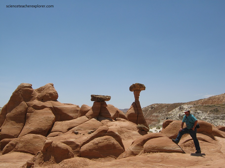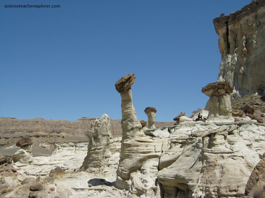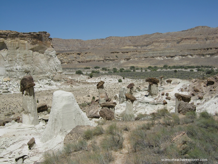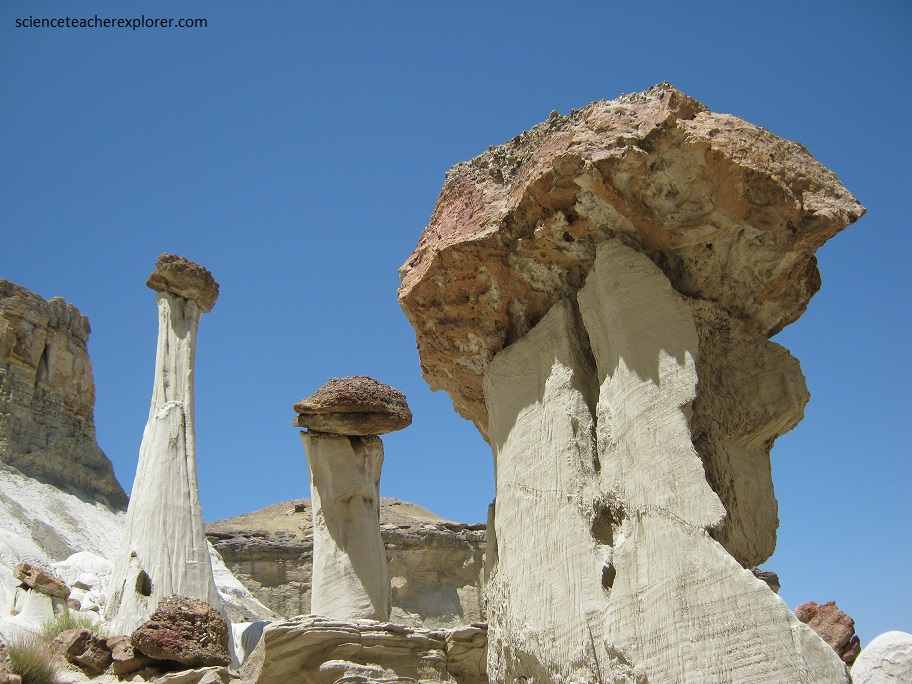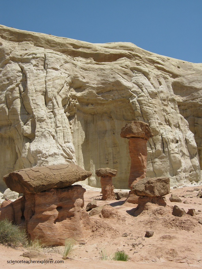 These fotogenic Toadstool/Mushroom-like features were created by 2 types of rocks with contrasting erosional characteristics.
