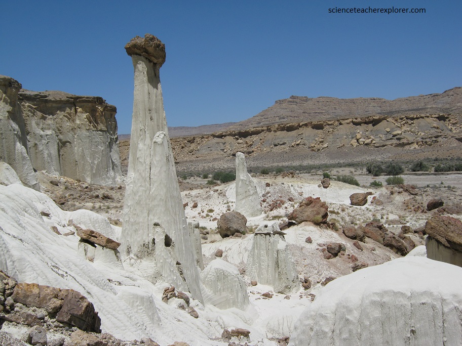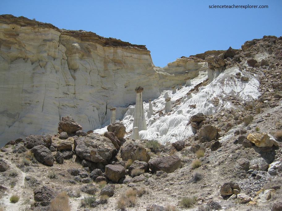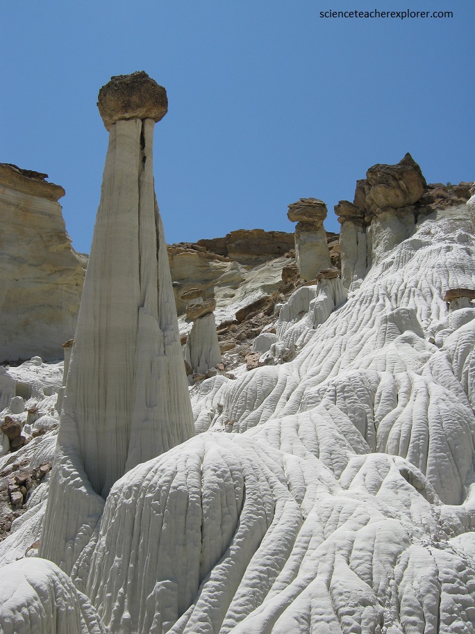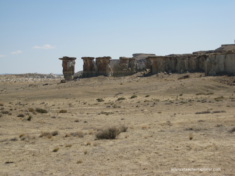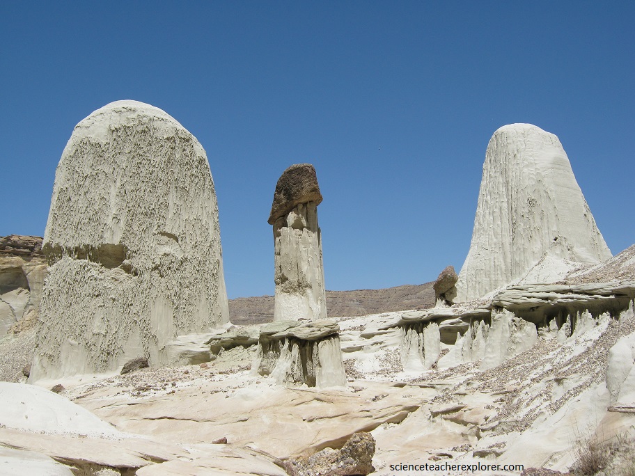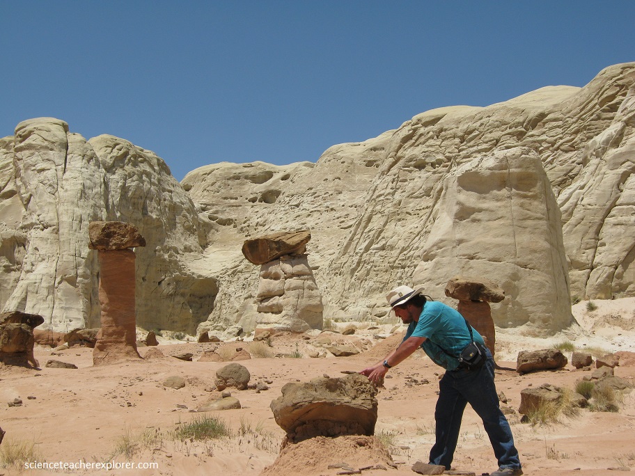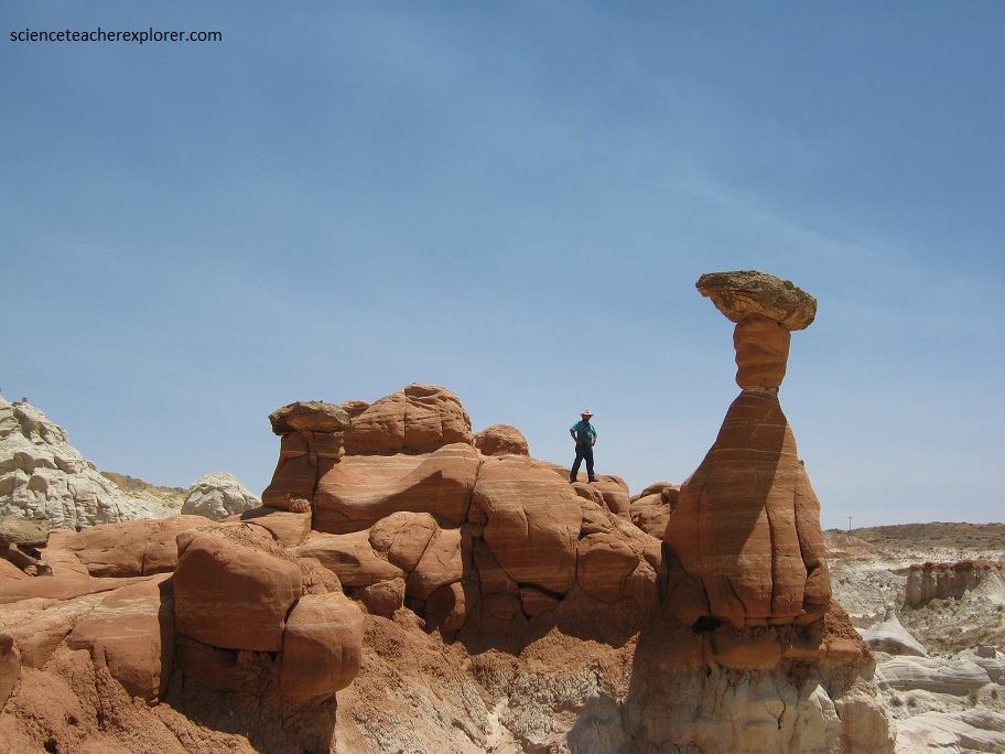 These fotogenic Toadstool/Mushroom-like features were created by 2 types of rocks with contrasting erosional characteristics.