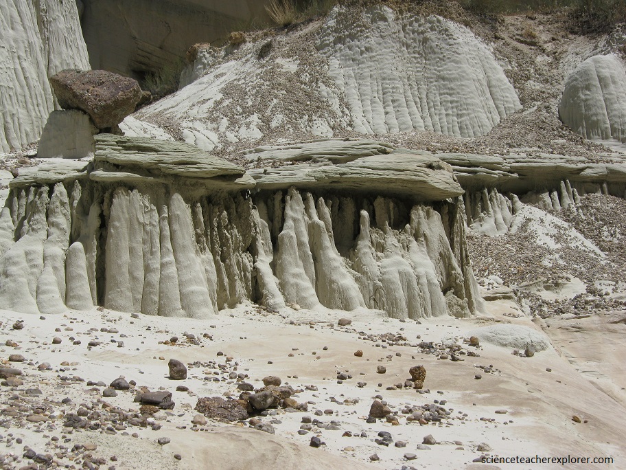 Over thousands of years, parts of the limy sandstone or conglomerate caprock broke off and rolled downhill to rest on top of a bench or a more eroded part of the Gunsight Butte Member.