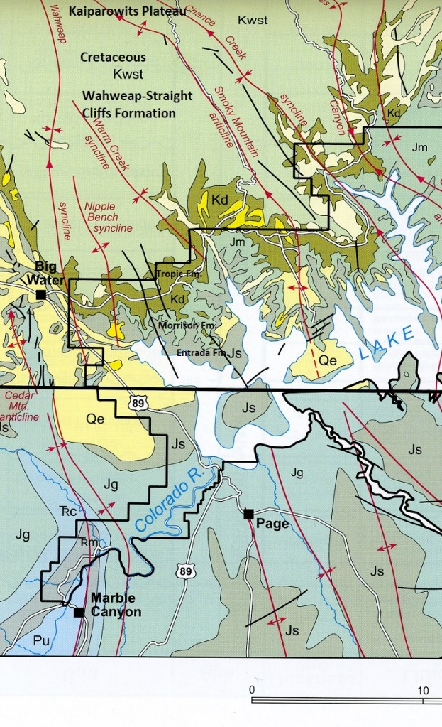 Generally, structural geologic features seen along this Kaiparowits Plateau road result from two phase of deformation. Many of the folds that are seen, began during the latter part of the Mesozoic (Jurassic-Cretaceous); and were initiated during the Sevier orogeny and later modified as compression of the region continued through the Laramide event (Cretaceous-Tertiary). During mid-Tertiary, uplift of the Colorado Plateau was accompanied by basin and range extension which affected the faulting of the monument region. The uplift of the Kaibab region and folding along the East Kaibab monocline accompanied initial formation of the canyons about 15 million years ago.