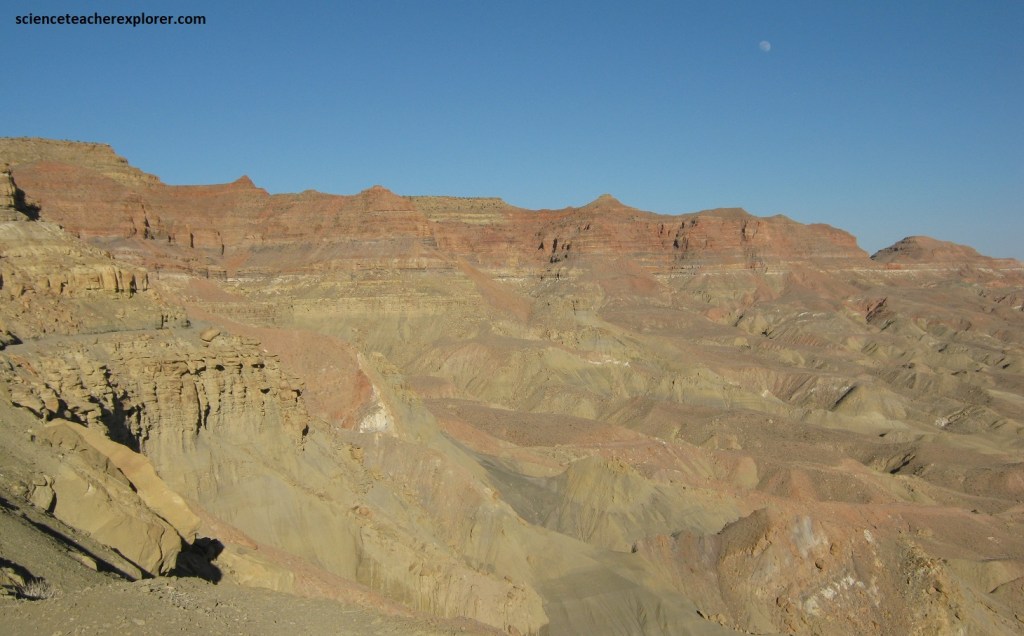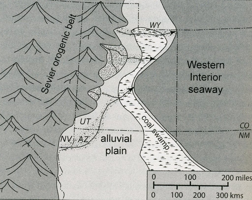 Cretaceous rocks in the Grand Staircase-Escalante National Monument are mostly limited to the Kaiparowits Basin Section. These Cretaceous rocks are 1600-2000m thick and were deposited in marine, mixed continental and marine, and continental environments. During this time mountains developed in western Utah and the Western Interior Seaway transgressed and regressed into and out of the monument area, (imaged below).