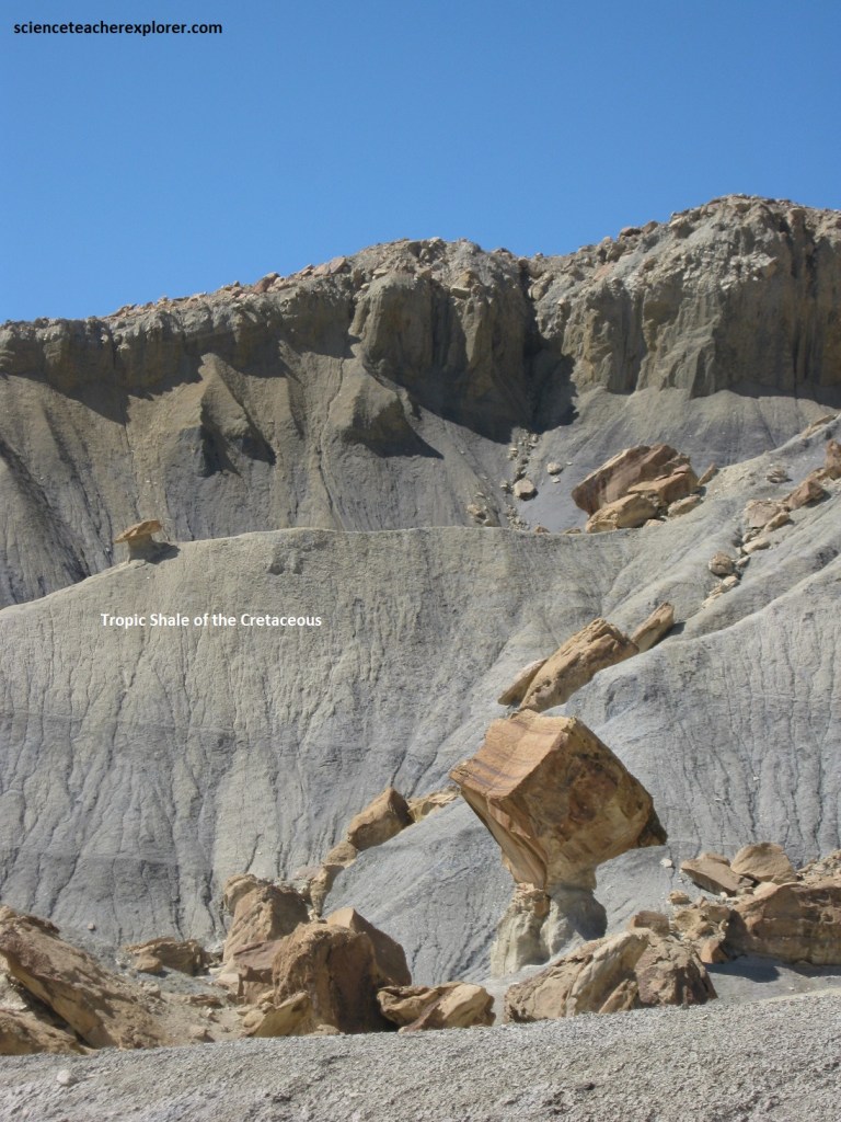 The Tropic Shale is a thinly laminated to thin-bedded mudstone and shale unit with lesser amounts of sandstone, bentonitic claystone, siltstone, and limestone. The muds were deposited on the floor of a shallow sea that had transgressed westward from the midcontinent area. Note that the undercutting produced by the weathering of soft-slope-forming Tropic Shale units, causing vertical cracks to open in the hard cliffs above them. Sometimes these boulders from Hoodoos seen already on this website.