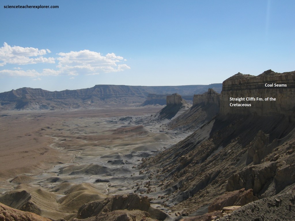 Pictured below, the Kaiparowits coal field is mostly based on coals found in the Cretaceous Straight Cliffs Formation in the Kaiporawits Basin section of the monument. These coals were first mined by settlers near Escalante in the late 1800s. All mining in the coal field ceased in the early 1960s as the local market converted to the use of petroleum products for heating purposes. However, coal remains an important scientific resource in the monument. At the top of the Straight Cliffs Formation, we could see what a natural coal outcrop looks like, how coal burns and oxidized along outcrop (Smoky Mountain), the nature of roof and floor rock, and many other aspects of coal geology.
