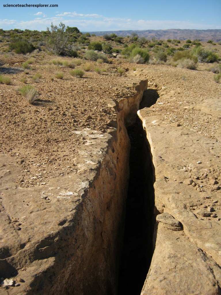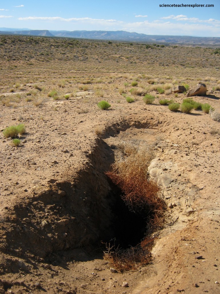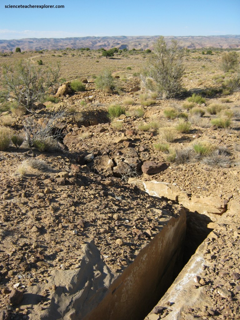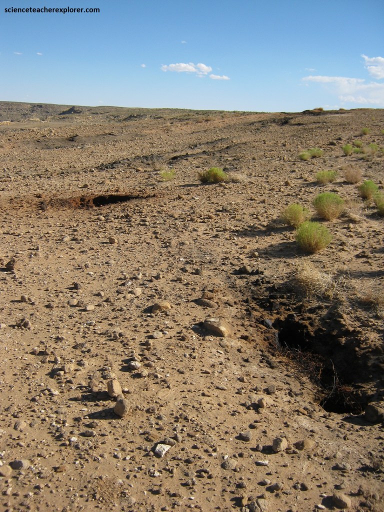Pictured above, numerous long fissures, or ground cracks, run parallel to the cliff edge. The cracks near the cliff are likely due to the erosional undermining of the cliff’s mudstone base. Other cracks developed as the underlying coal seams burned out and reduced to ash, leaving little to no support for the overlying sandstone. These cracks eventually propagate to the surface, allowing additional oxygen to reach the fire, so it is unlikely that a lack of oxygen will naturally lead to the fire’s demise.