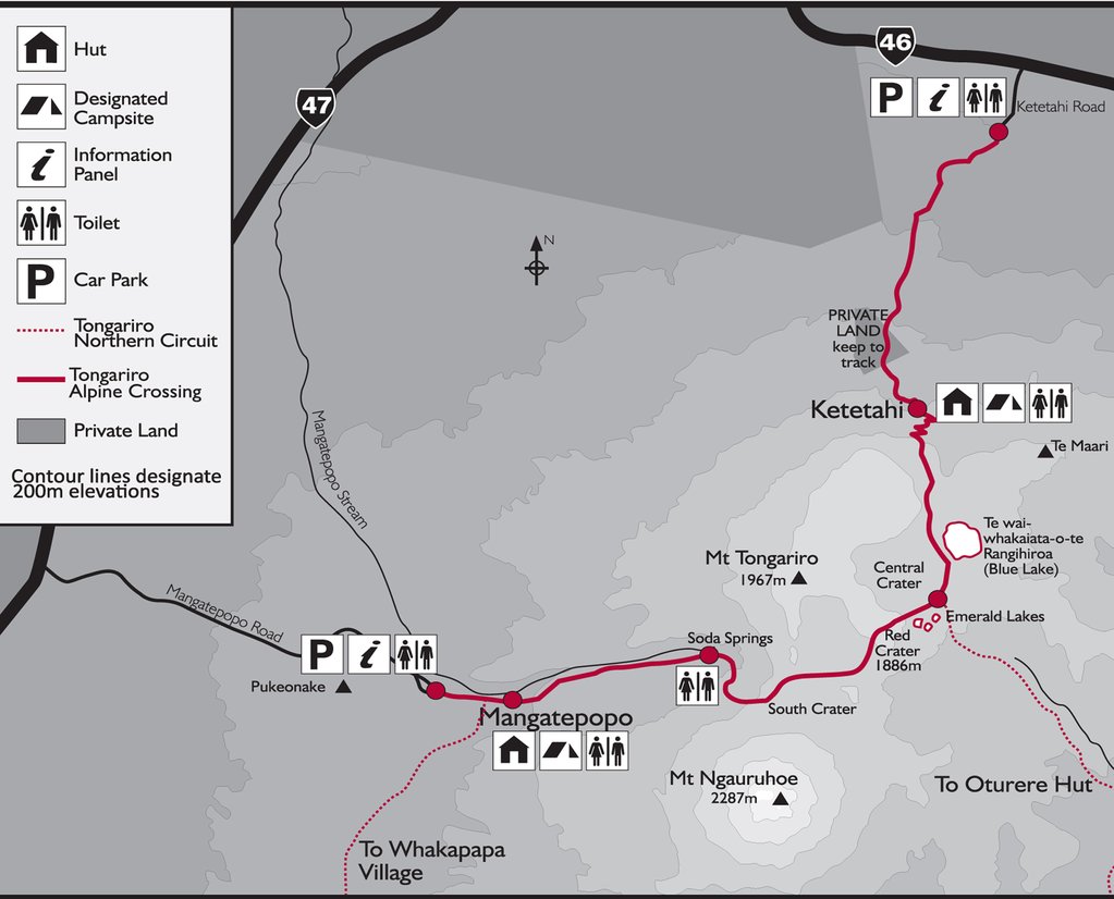 Pictured above, the track begins at the western end near the Mangatepopo Hut with a low gradient until the foot of the steep Tongariro saddle. Almost the entire length of the crossing is in volcanic terrain with no vegetation and fully exposed to weather – at moderate altitude.
