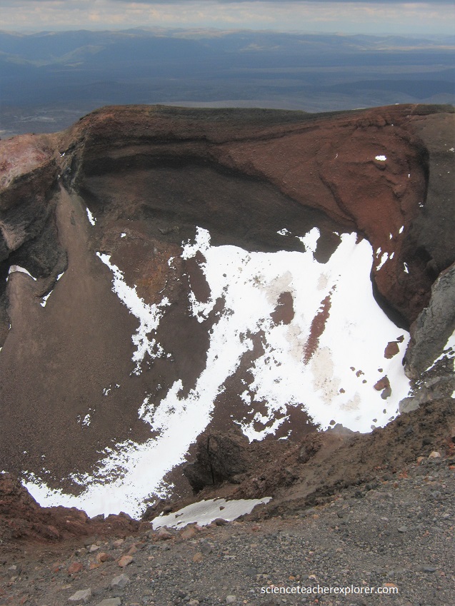 Red Crater was formed about 3000 years ago. It lies within a scoria cone which rests on top of the older Tongariro lava flows. The red colour is due to the presence of oxidised iron in the rock.