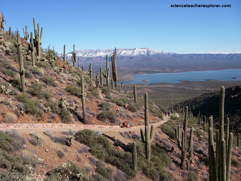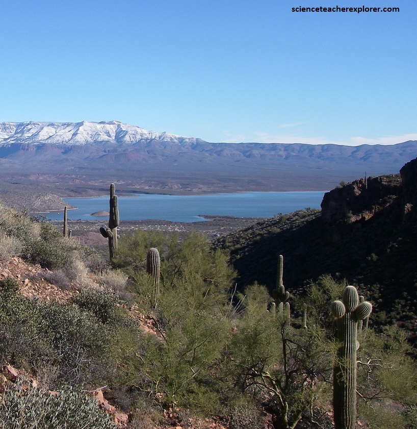 Pictured above, Tonto Basin is viewed from the Tonto National Monument that encompasses three rugged canyons with elevations ranging from 900 – 1,200 m, as well as the Salt River’s alluvial plain in the north. The park’s foci are two well-preserved Salado cliff-dwellings, Lower Ruin and Upper Ruin. I’m taking the picture from the Lower Ruin, looking east towards Roosevelt Lake and Tonto Basin below.