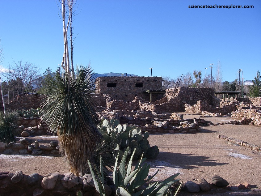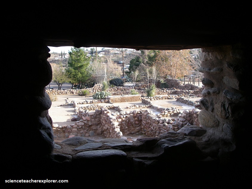 Pictured above, Besh-Ba-Gowah architecture consists of multi-storied, masonry room block clusters connected by long, narrow corridors or elongated plazas. These room blocks and corridors are situated around a large communal plaza area measuring 12 meters north–south by 27 meters east/west.