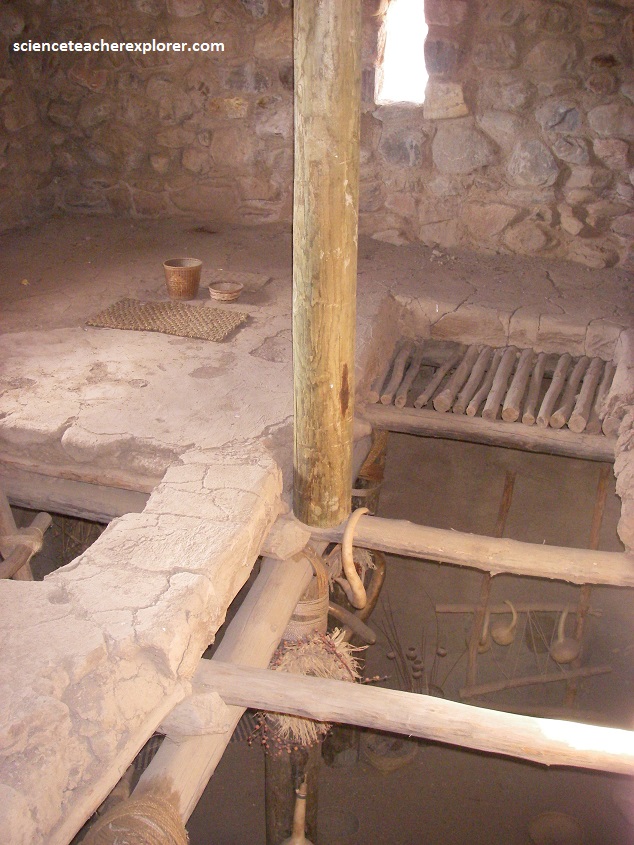 Pictured above, 10 doorways, rectangular and T-shaped, with wooden lintels punctuate the walls, as do loopholes on the second story. Floors are composed of packed earth and clay or bedrock, while roofs consists of one central bearing beam (viga) supported by a timber post and overlaid with sycamore or juniper poles (latía) and saguaro cactus ribs, grass, or reeds then covered with layers of adobe clay. The Lower Salado-Ruin was excavated by archaeologist Lloyd Pierson and stabilized in 1950. The above dimensions were provided from his personal notes, during that time. Apparently, steel tension rods and braces were installed to prevent lone masonry walls from tumbling, while the natural rock ledge was artificially built outwards to allow visitor traffic around the site.