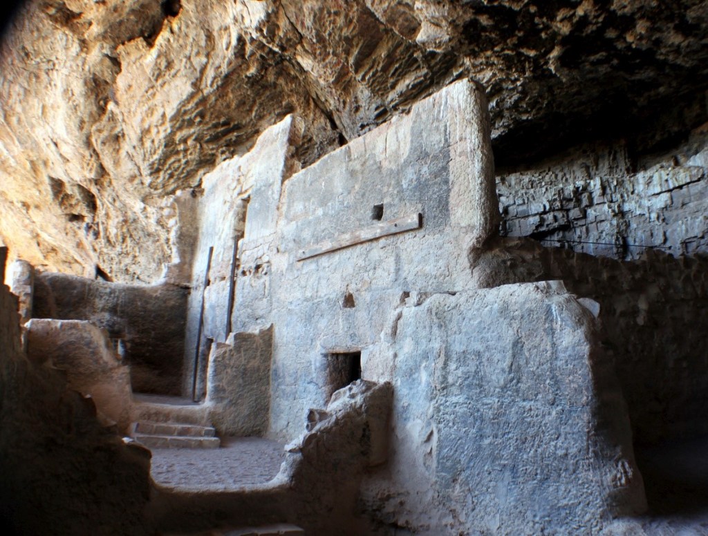 Pictured above & below, the Lower Ruin is a small “pueblo-house” built in a cave measuring 130 m wide and 10 m high. Situated some 120 m above the valley floor, the cliff dwelling looks out onto Roosevelt Lake in Tonto Basin, 5 km to the northwest. The Salado pueblo’s two-story walls, built atop loose fill, comprise rough, tapering courses (measuring 60 cm high) of local, uncut quartzite blocks adhered with a clay mortar mixed with gravel. The exterior was covered with tan-colored adobe clay, while mud was used to plaster the interior walls.