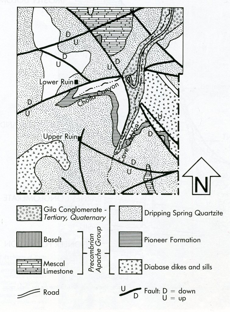 Over the geological history, layer upon layer of siltstone, sandstone, mudstone, and limestone were deposited on the tidal flats and in the shallow marine environment of the western continental shelf. This thick layer of Precambrian sediment, known as the Apache Group, formed the rocks now exposed in the great cliffs that tower above the Tonto Basin. Then followed millions of years during which the geologic record for this part of Arizona is eroded away and not known. However, during the late Mesozoic and early Cenozoic Eras, (50-100 m.y.a.) tremendous forces wrenched at the land. The plates of earth’s crust relentlessly collided, thrusting huge blocks of rock upward into jagged, towering mountain ranges. The rocks were ripped apart and contorted. Another cycle of erosion followed, wearing away the mountains.