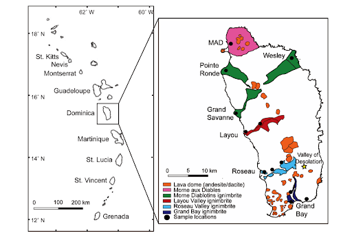 The geologic setting of the Trafalgar and Middleham falls are the result of depositional processes and tectonic forces caused by volcanoes, landslides, seismic movements and river that have produced the bedrock geology of Dominica. In geological terms, Dominica is a young island. The surrounding cliffs were formed during the period of volcanic eruptions when the heated ash or pyroclastic flow spread out around the volcanic domes to form layers of ash and rock welded together with heat. Known as welded tuffs, these layers are hundreds of feet thick. Over a period of thousands of years, streams and rivulets eroded deep ravines into the compact ash and debris. Cutting out cliffs over-which the waterfalls cascade.