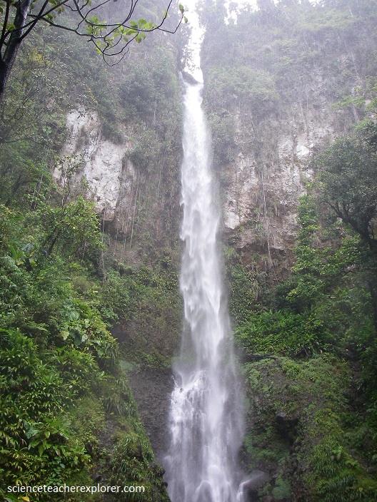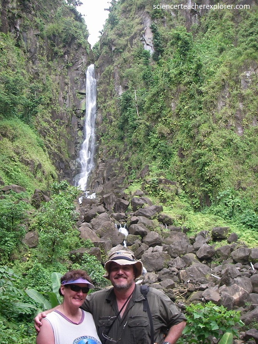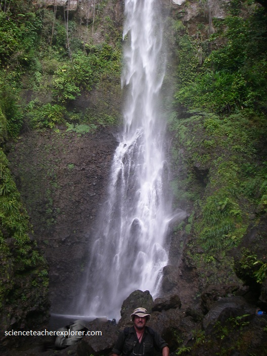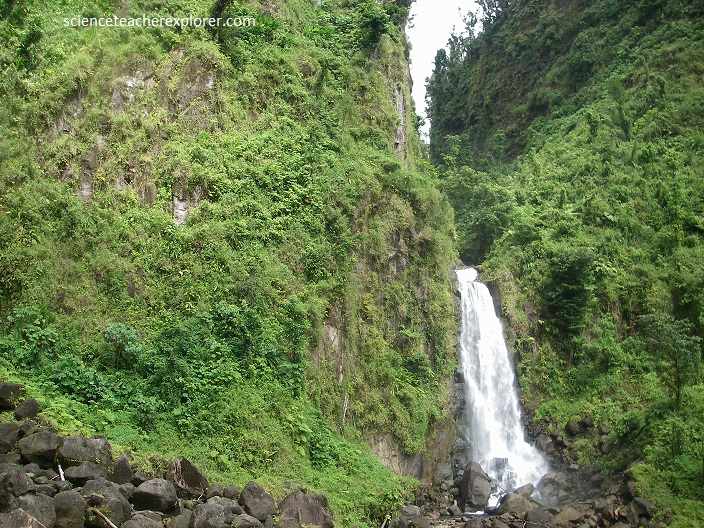 A more challenging, (4 km away), hike through dense rainforest was required to reach the breathtaking Middleham Falls, (pictured below), the highest waterfall in Dominica. [Note: Waterfalls are usually formed in rocky areas due to erosion. They form when there is a hard layer of rock covering a soft layer of rock. Water flows over hard rock. When it reaches the soft rock, the water starts to erode or wear away the soft rock. Over thousands of years, the soft rock is eroded and the river begins to cut down vertically into the rock. this makes a cliff over which the water can topple. Over time, the cliff becomes steeper and deeper and a waterfall is formed. At the bottom of the waterfall a plunge pool is created. Some of the water splashes onto the cliff and makes a large, hollow plunge pool by a process called undercutting.]