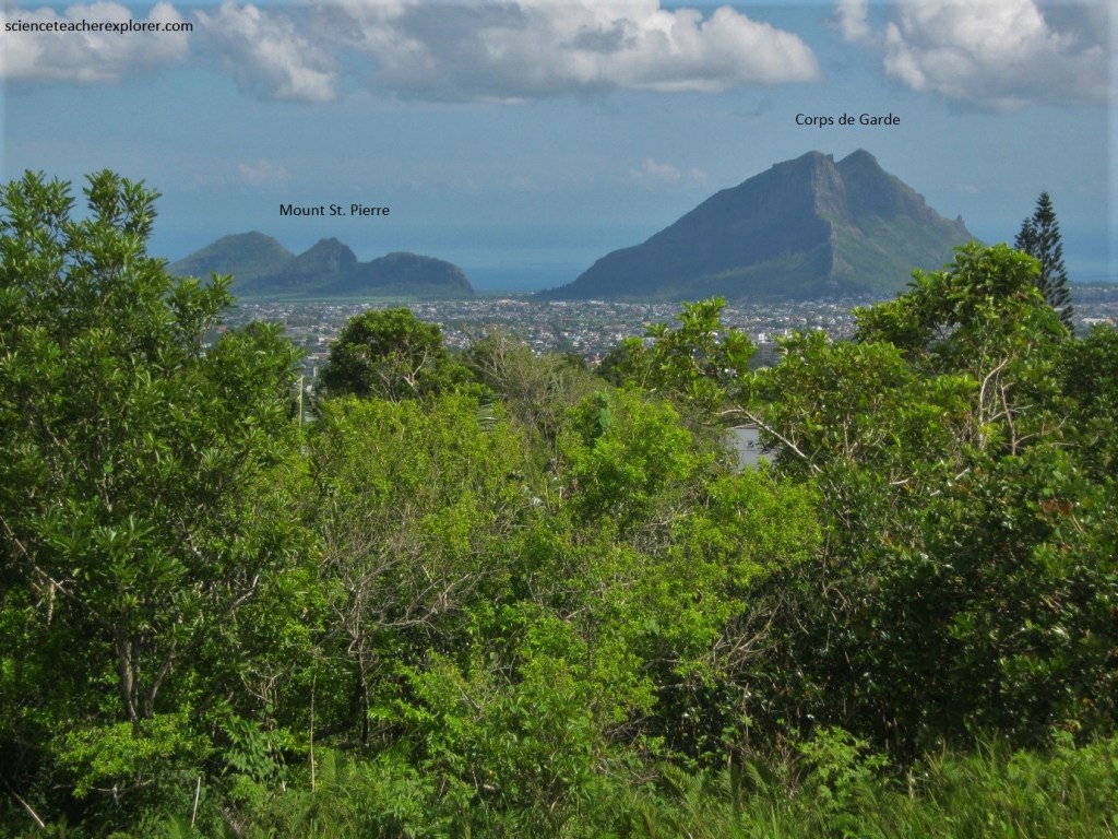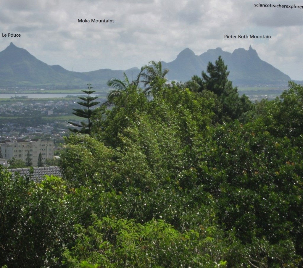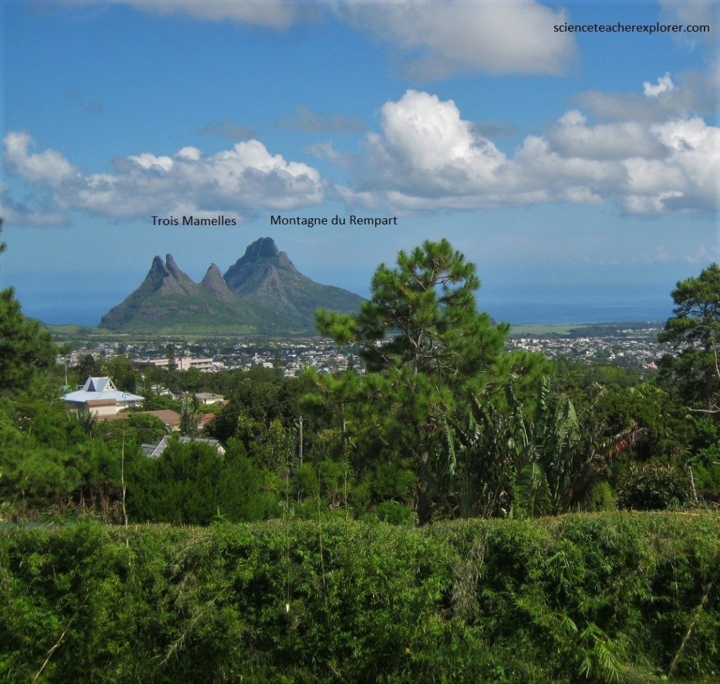 Pictured below, the panoramic view looks out over the plateau towns and the mountains to the north and northwest. To the west are the three conical peaks of Trois Mamelles, and Montagne du Rempart, described by Samuel Clemens as a “dainty little vest-pocket Matterhorn”.