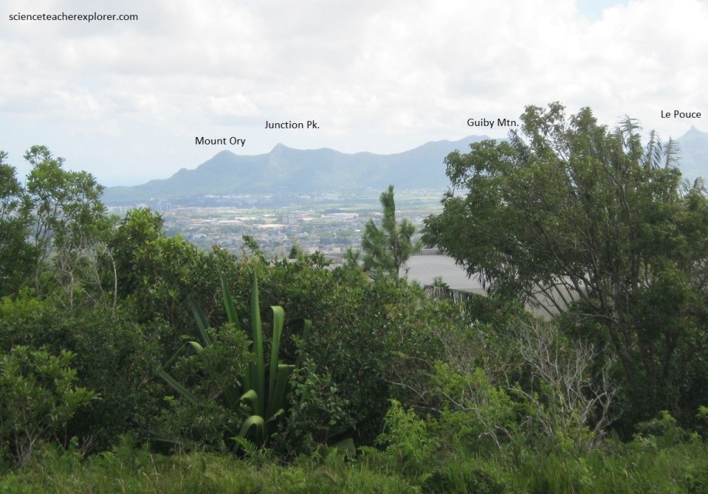 Pictured below, the view to the north is Mount Ory, Junction Pk., Guiby Mtn., Le Pouce and Pieter Both Mountain within the Moka Mountains. Pieter Both Mountain has a massive boulder balanced on its summit.