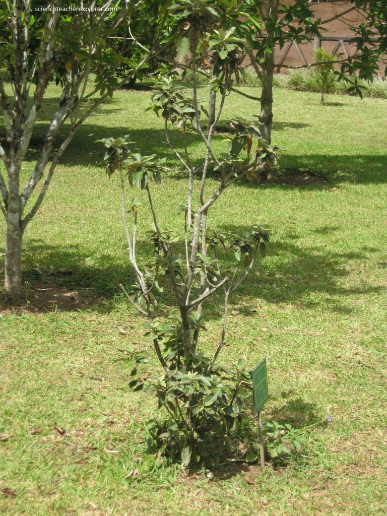 Ramosmania rodriguesi, commonly known as Cafe Marron, is a tree native to the Mauritius. The plant has an average size of about 1.5 to 1.8 m and features white five-petal star-shaped flowers. Its French common name Cafe Marron translates to “brown coffee”. It was thought to be extinct until a single surviving tree was spotted by a schoolboy in 1979. In 2003, the café marron bore its first fruit with viable seeds. Slow but steady efforts have been made to grow more café marron trees and speed up the pollination process. Young R. rodriguesi leaves have obtuse, rounded apexes while mature leaves have rounded, almost truncated apexes. The petals’ tube is funnel-shaped and leathery with a length of 1 centimeter. The plant’s fruit is thin and elongated.