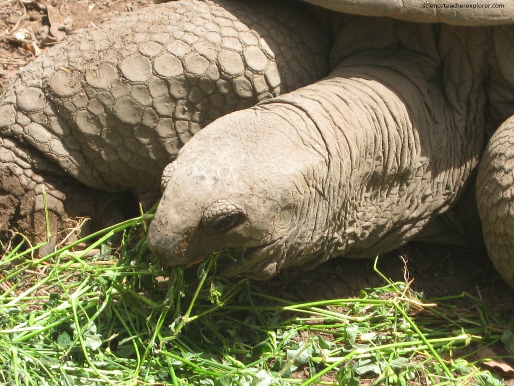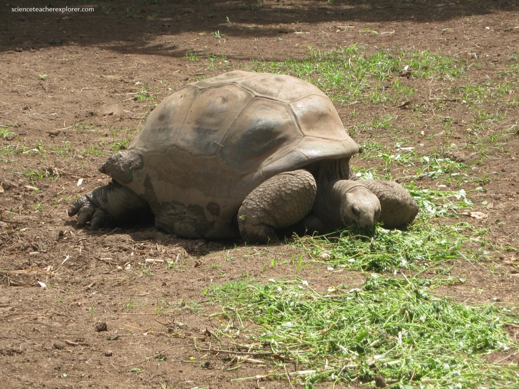 This Aldabra Giant Tortoise is a meter in length and can live up to 150 years. The tortoises are herbivorous and cold-blooded. Males and females can be told apart by the shape of their bellies. Females have a flat belly, while males have a hollow belly, making it easier for them to mate. Females lay a single clutch of between 9-25 eggs every year. They lay them in nest up to 30cm deep, which they excavate using their hind feet.